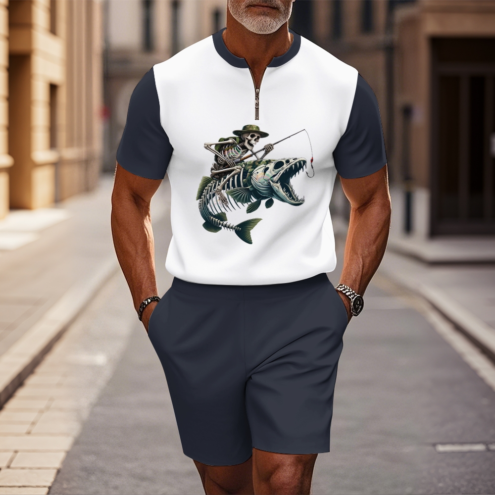 Men's fashion casual round-neck zipper geometric printed short-sleeved two-piece set 2505000408