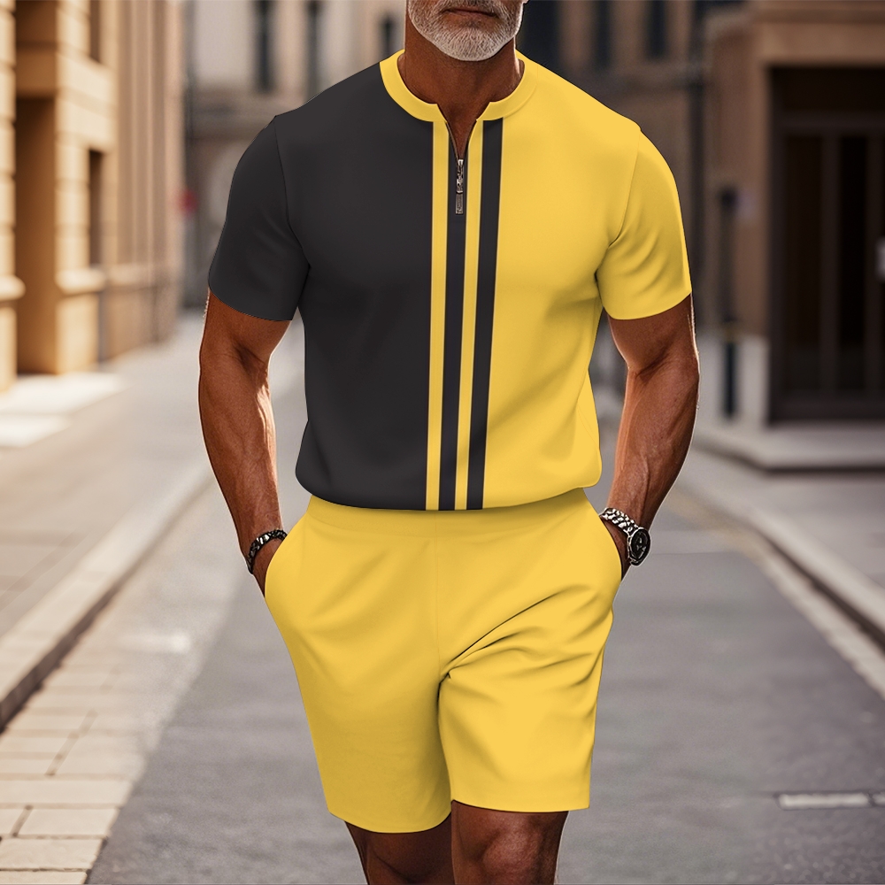 Men's fashion casual round-neck zipper geometric printed short-sleeved two-piece set 2505000416