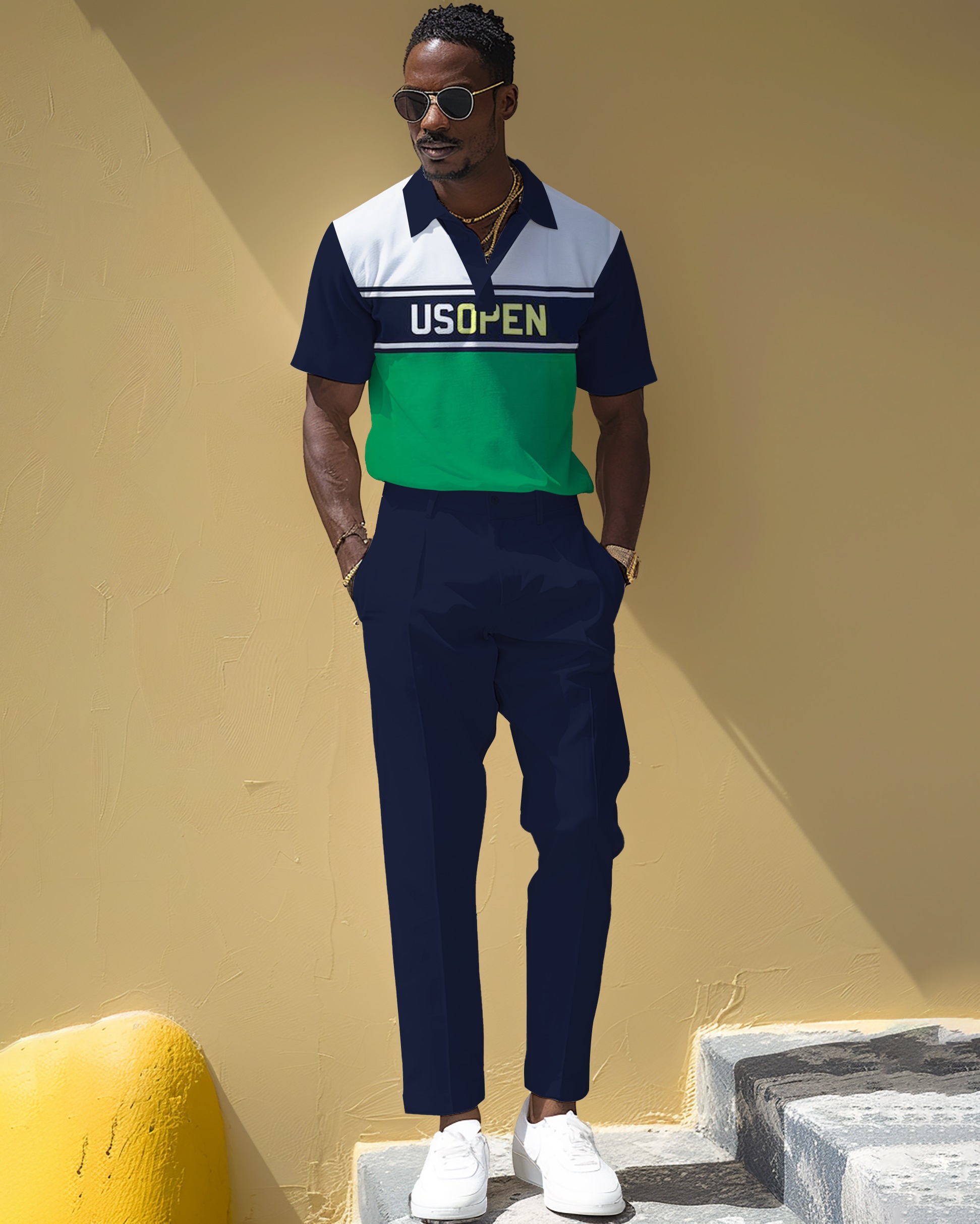 Clean and tidy look: Make sure the overall look of your polo shirt and trousers is clean and neat. Note that the collar of the Polo shirt should be neat, and the cuffs can be rolled up appropriately to add a casual feel. Trousers should be well-fitting and comfortable, and the legs should hang neatly.