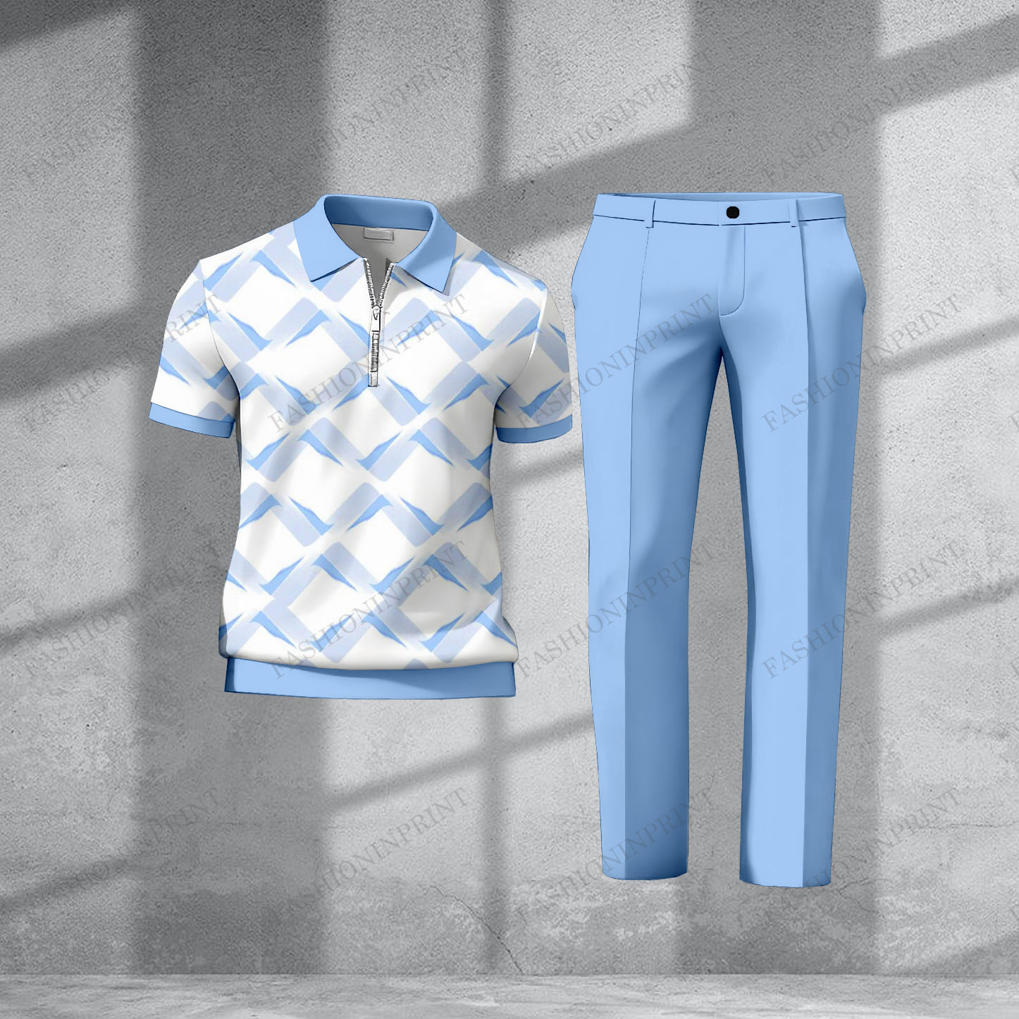 Men's Casual Blue & White Color Matching Geometric Printed Short Sleeved Zipper Polo Shirt & Trousers Two-Piece Set