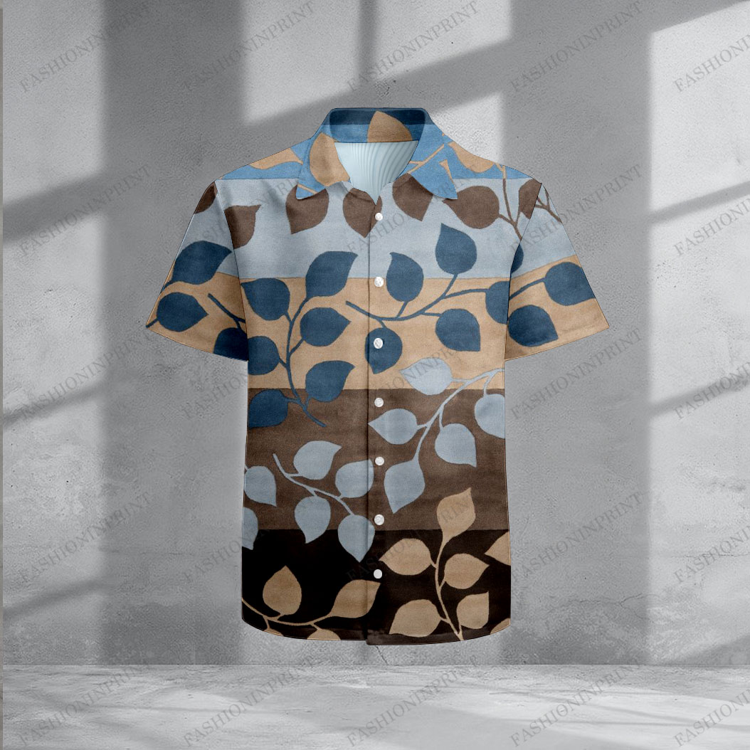 Men's Casual Coffee & Blue Color Matching Leaves Print Short-Sleeve Shirt