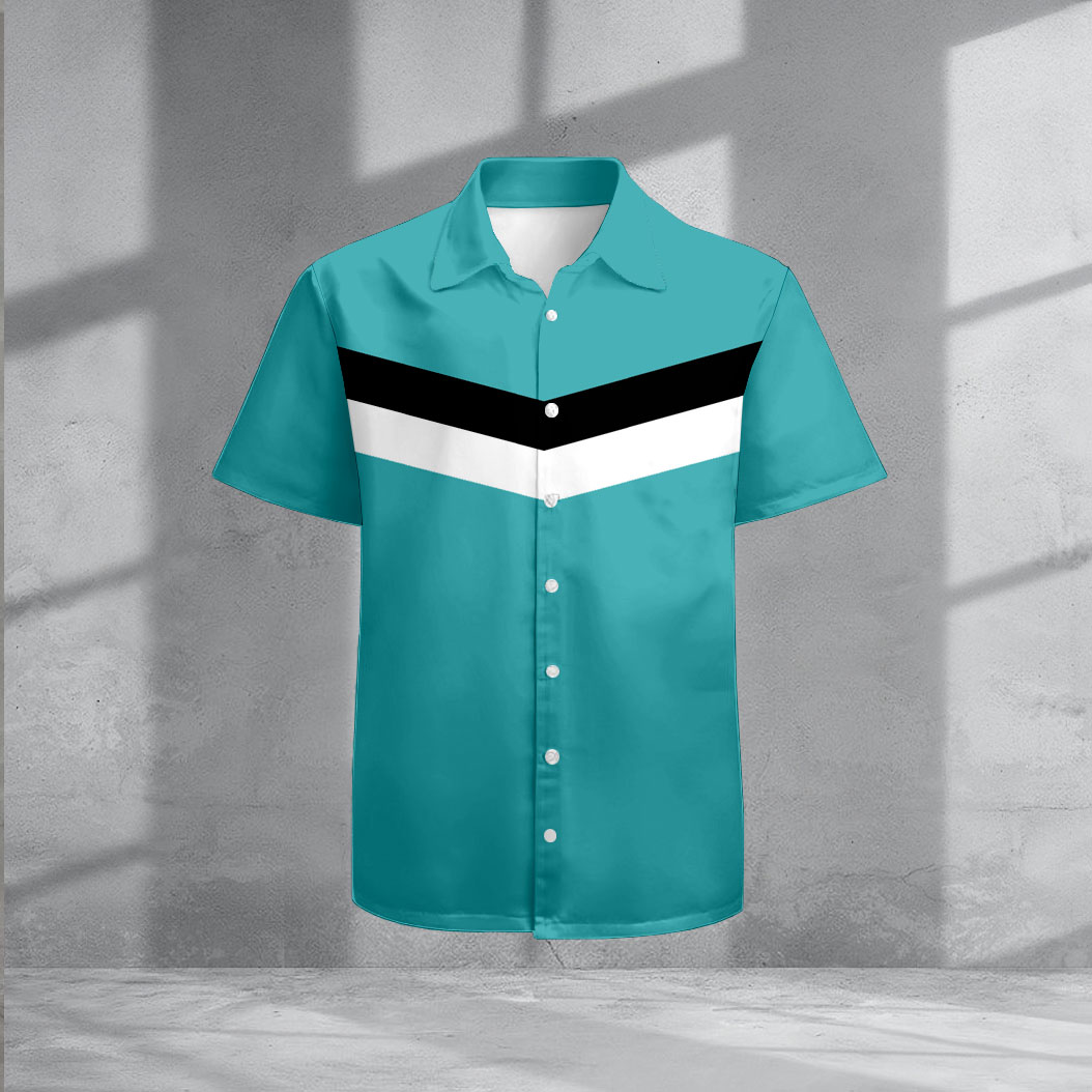 Men's Casual Blue Green Color Matching Print Short-Sleeve Shirt