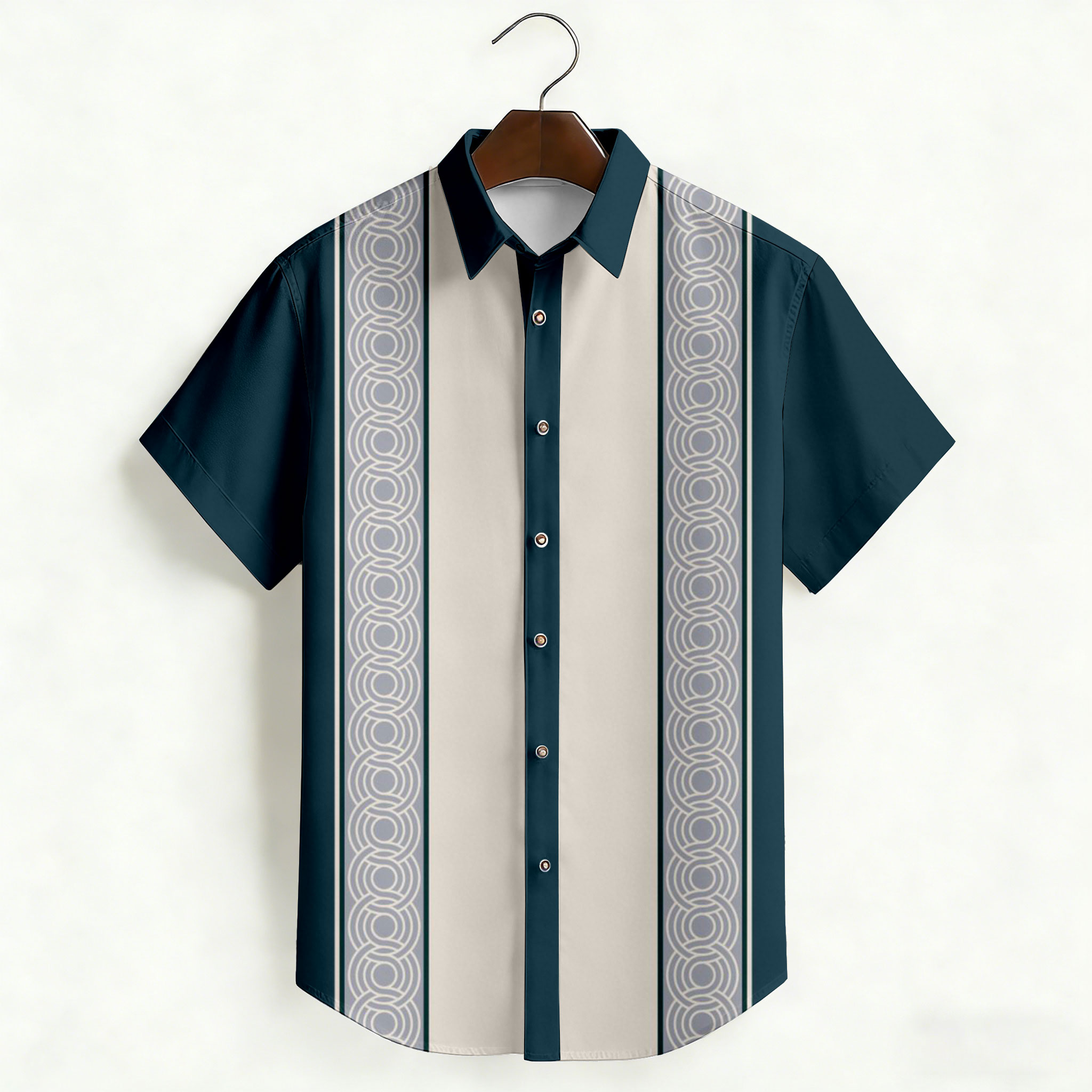Men's Casual Blue & Beige Color Matching Striped Print Short-Sleeve Shirt
