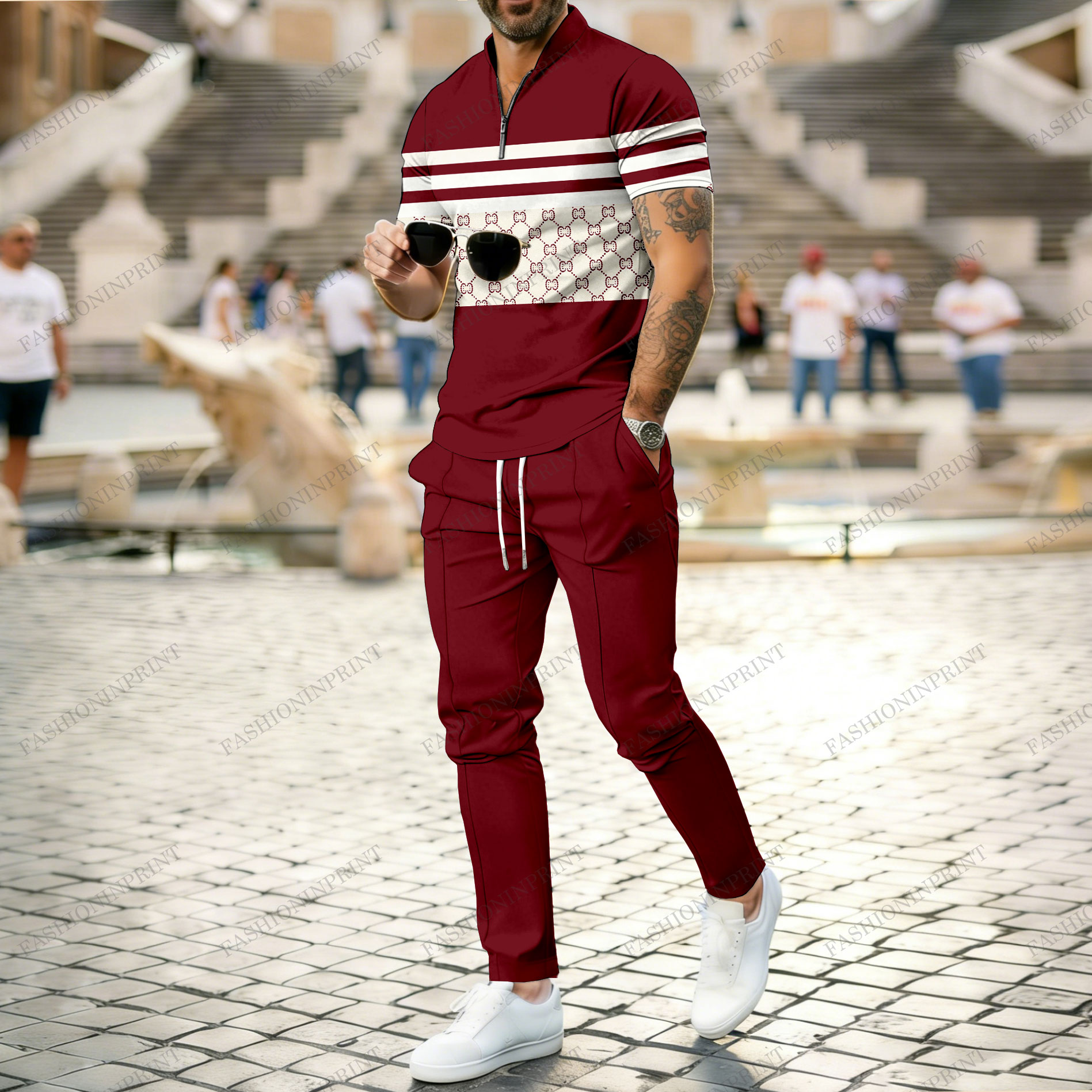 Men's Casual Red & White Color Matching Geometric Printed Short Sleeved Polo Shirt & Trousers Two-Piece Set