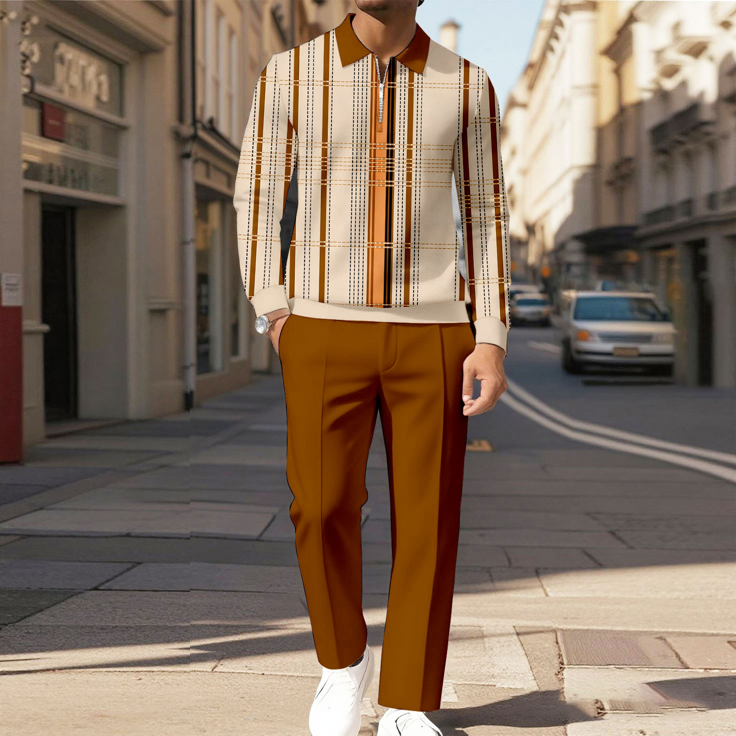 Men's Casual Color Matching Checked Striped Printed Polo-Collar Zipper Long Sleeved Brown Trousers Two-Piece Set