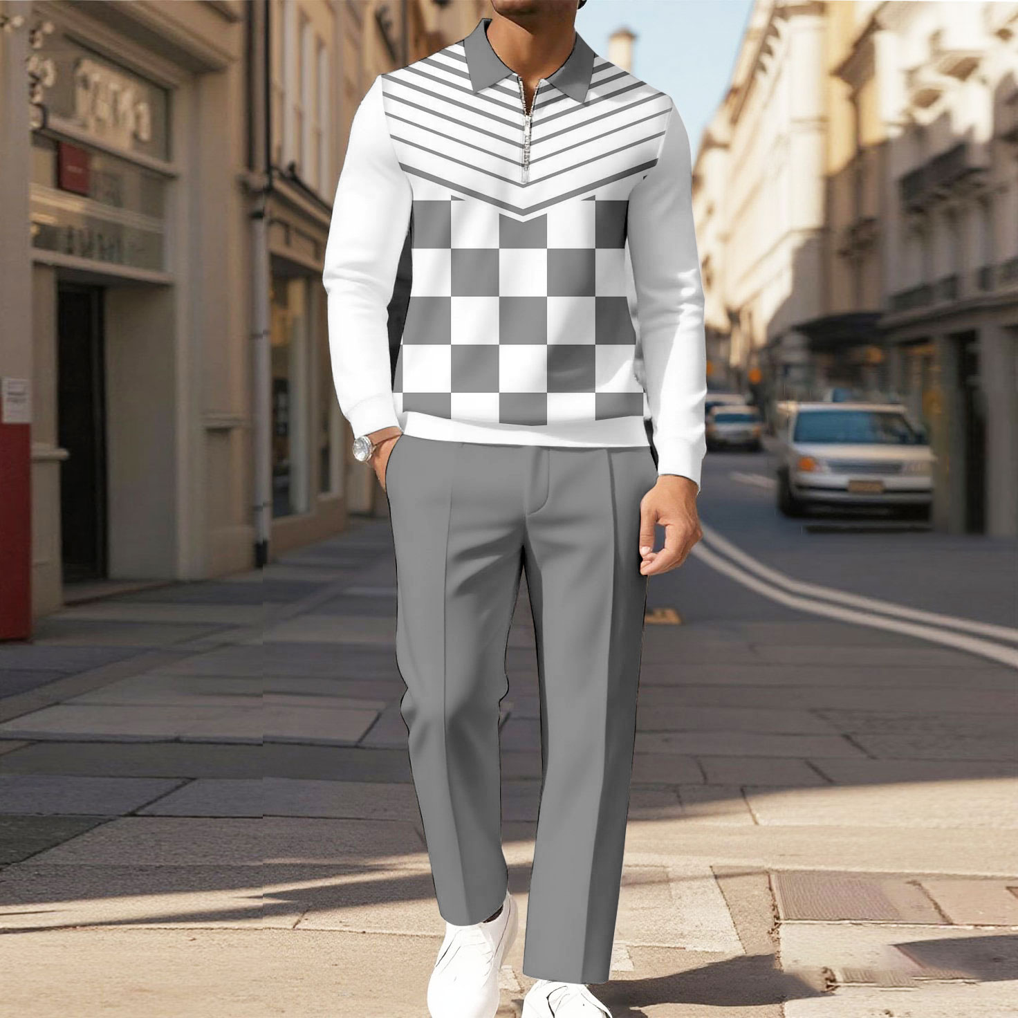 Men's Casual Light Gray Color Matching Checked Printed Polo-Collar Zipper Long Sleeved Trousers Two-Piece Set