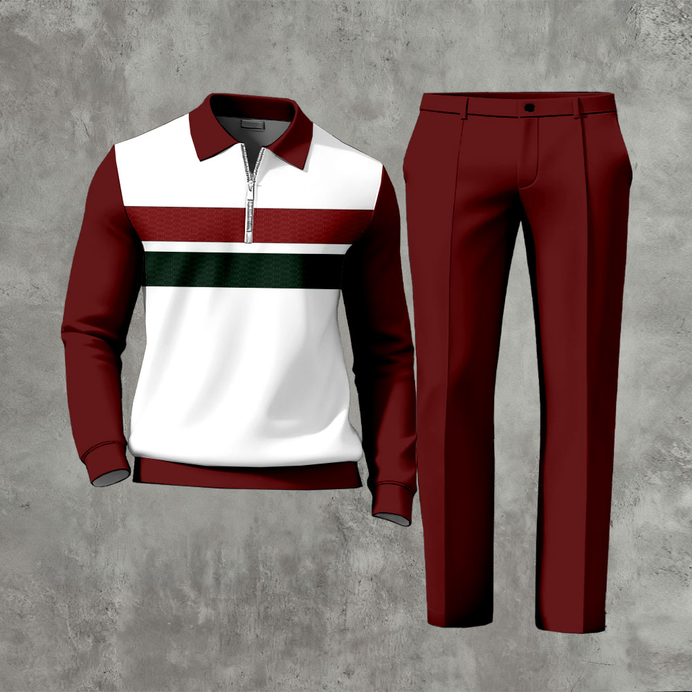 Men's Casual Color Matching Printed Polo-Collar Zipper Long Sleeved Trousers Two-Piece Set