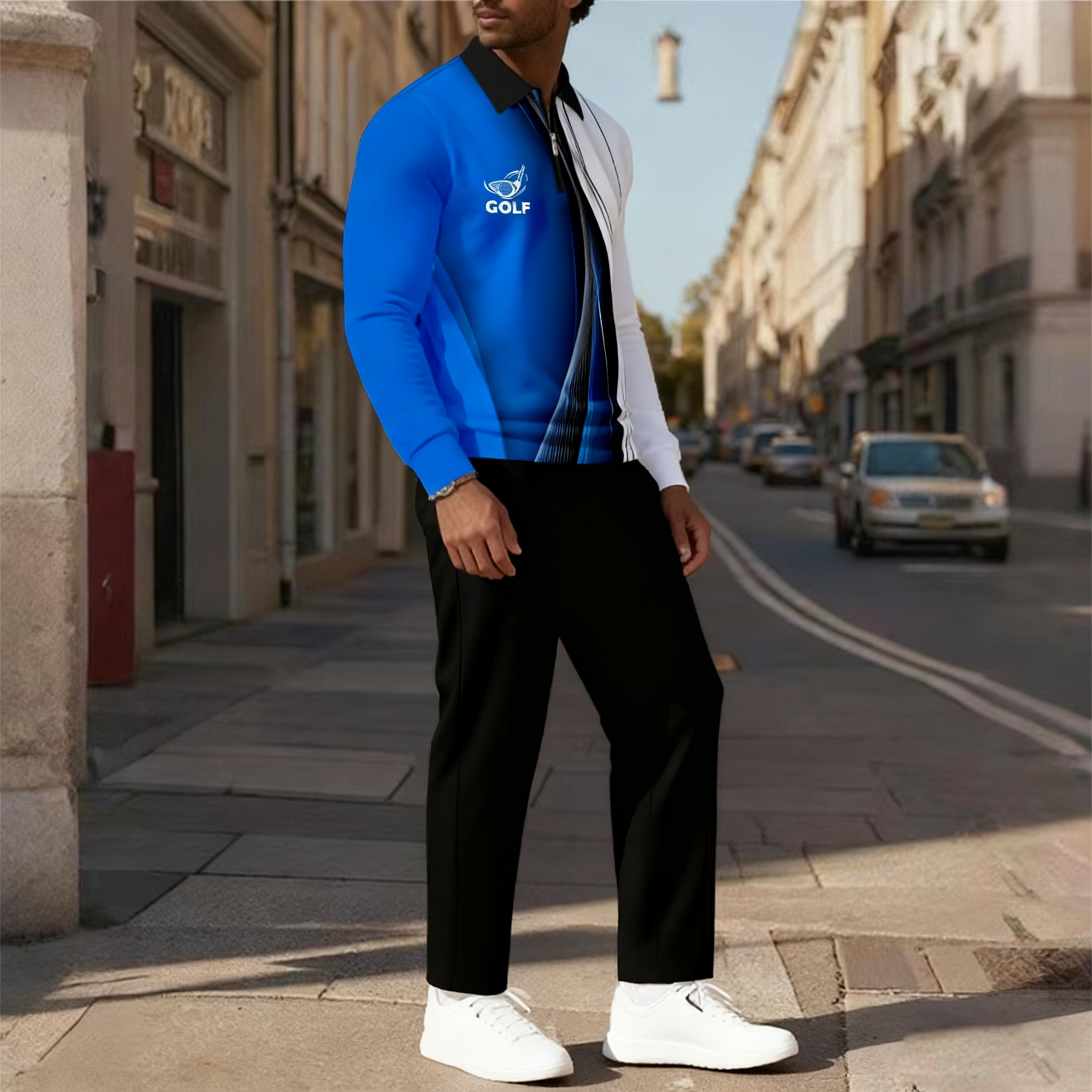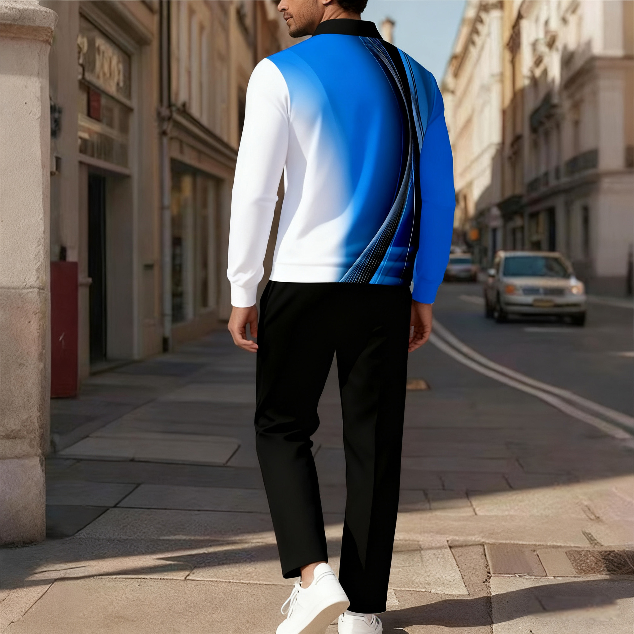Men's Casual Color Matching Printed Polo-Collar Zipper Long Sleeved Trousers Two-Piece Set