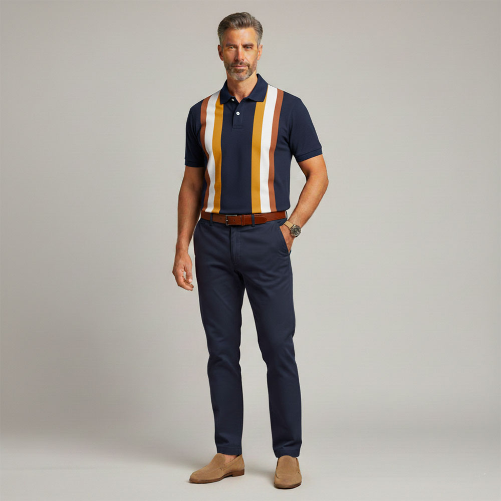 Men's Casual Navy Blue Color Matching Striped Printed Short Sleeved Polo Shirt & Trousers Two-Piece Set
