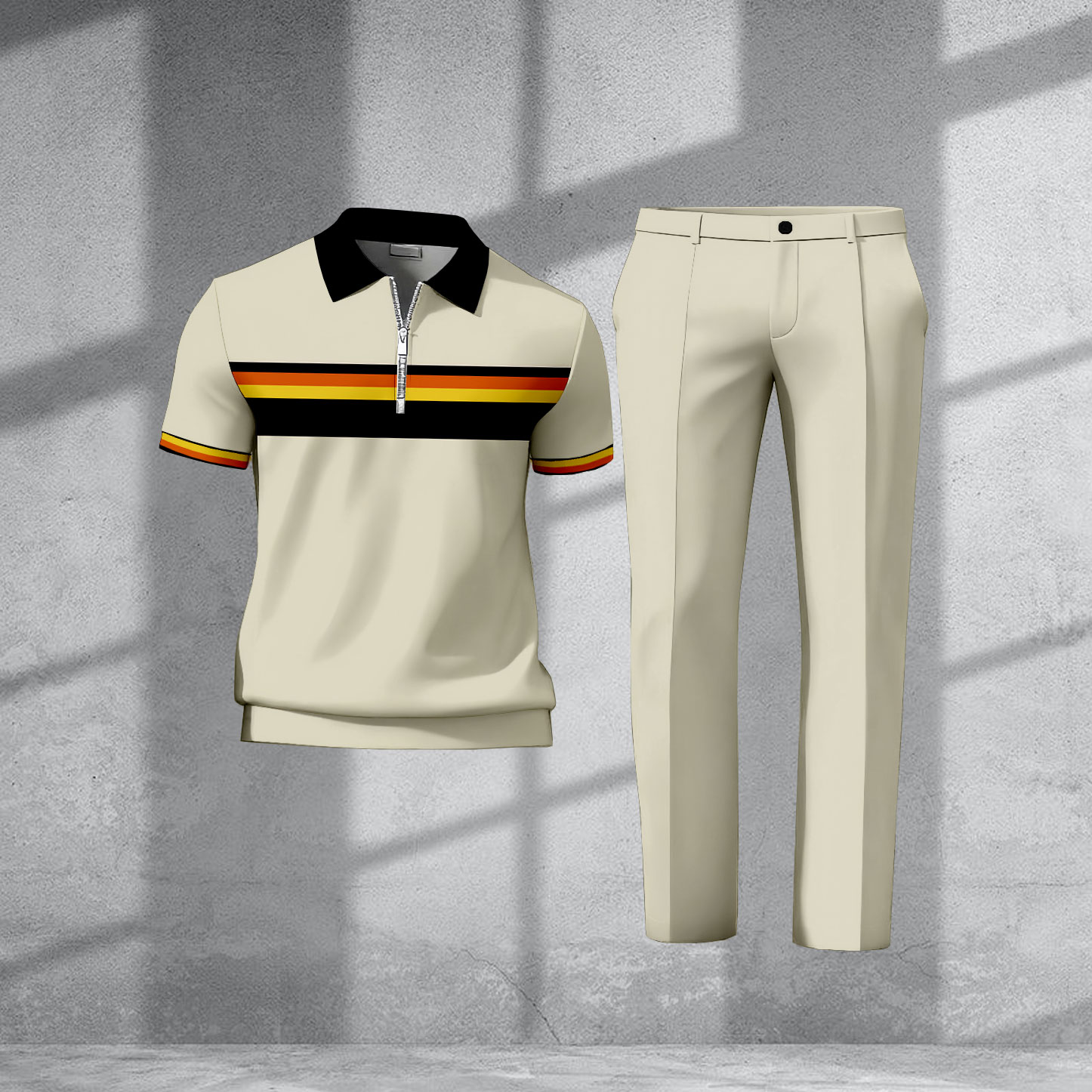 Men's Casual Apricot & Black Color Matching Printed Short Sleeved Zipper Polo Shirt & Trousers Two-Piece Set