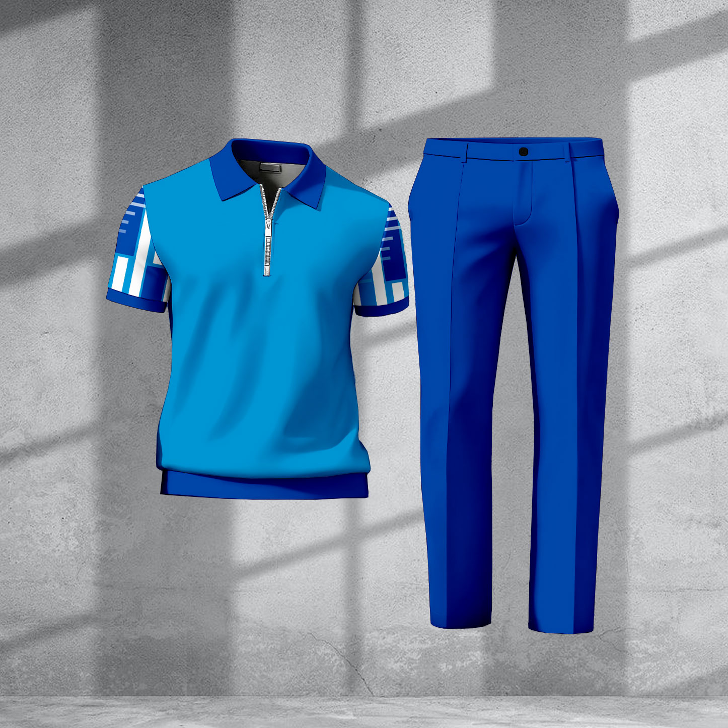 Men's Casual Blue & Royal Blue Color Matching Printed Zipper Short Sleeved Polo Shirt & Trousers Two-Piece Set