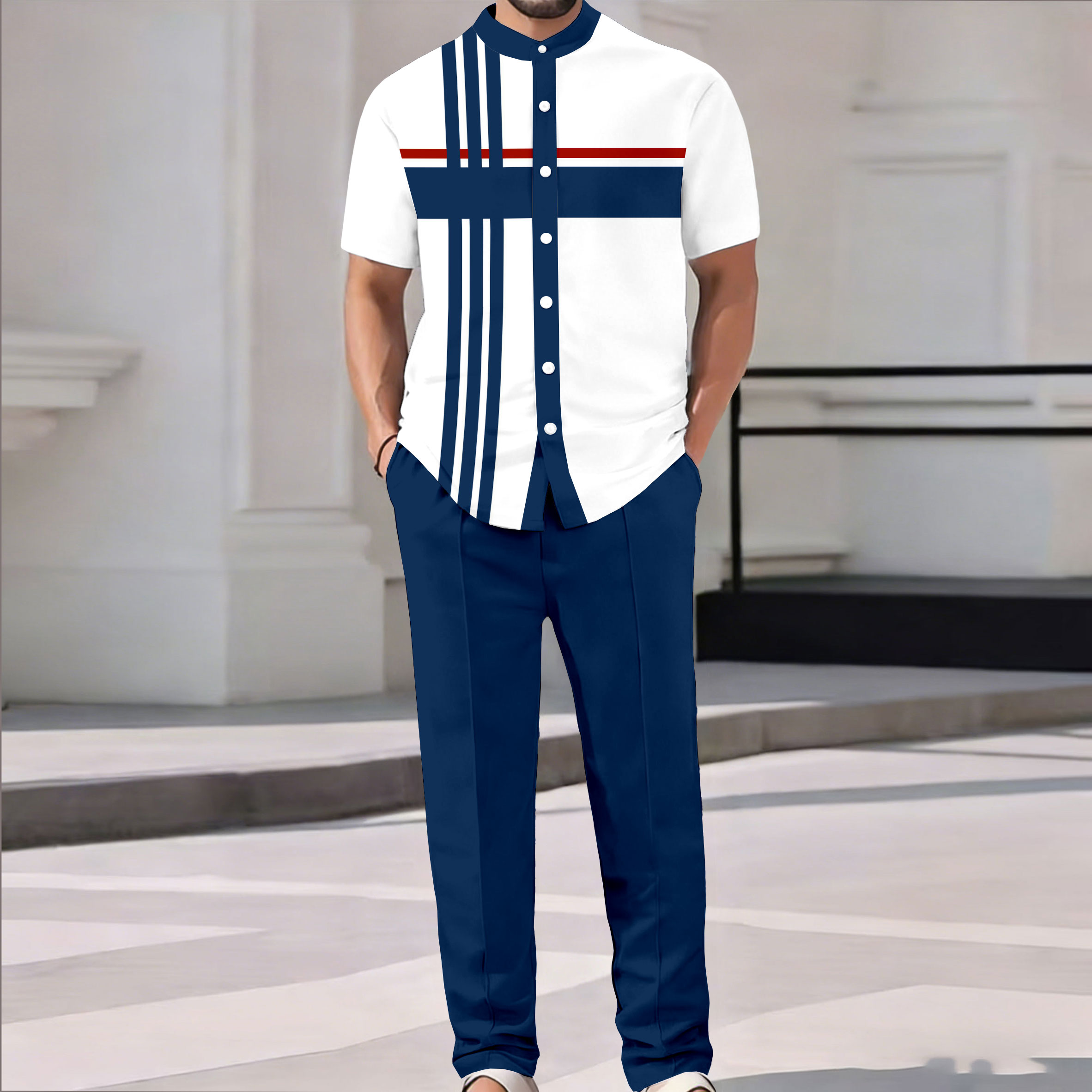Men's Casual Royal Blue & White Color Matching Geometric Printed Short Sleeved Shirt & Trousers Two-Piece Set