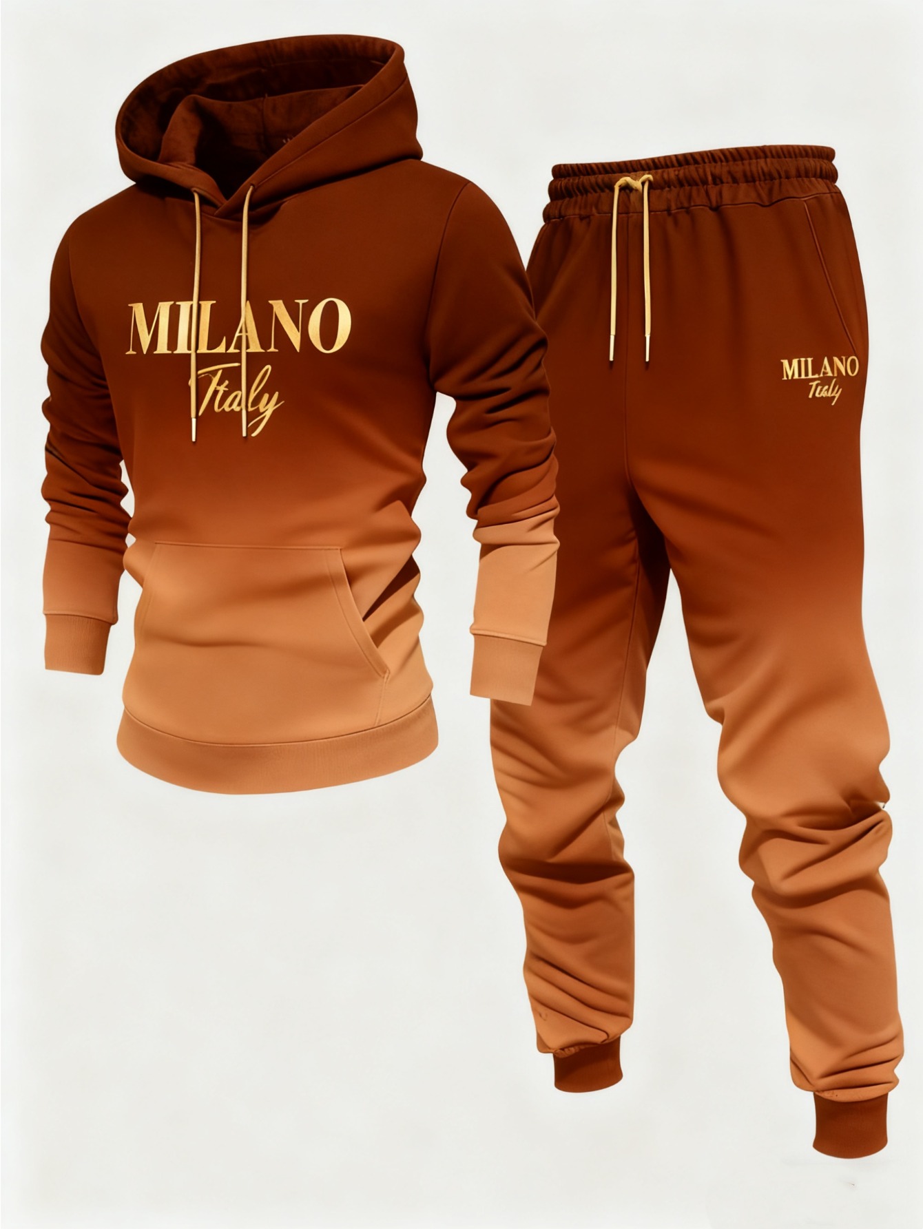 Men's Casual Orange Gradient Color Matching Printed Hoodies Long Sleeved Sweatshirts & Sweatpants Two-Piece Set