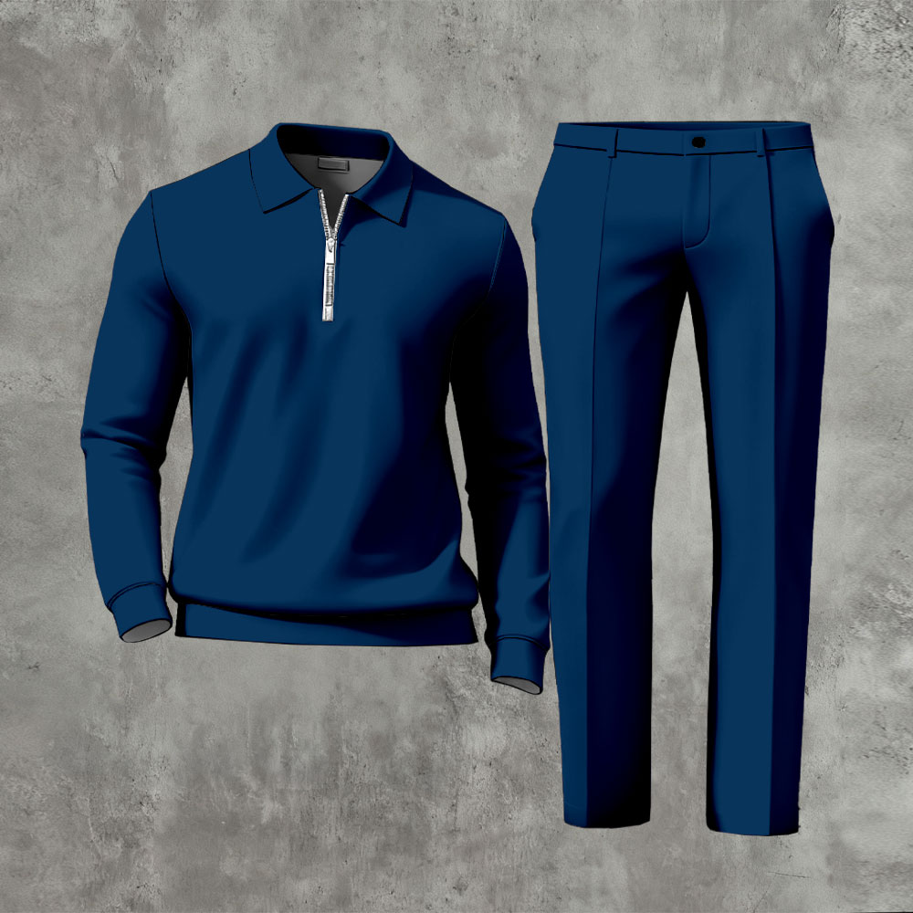 Men's Casual Solid Color Polo-Collar Zipper Long Sleeved Trousers Two-Piece Set