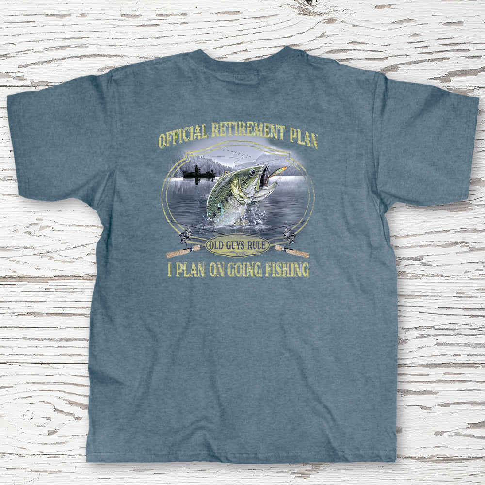 | Shirt Text: Official Retirement Plan - Old Guys Rule - I Plan On Going Fishing |