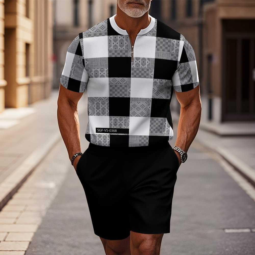 Men's fashion casual round-neck zipper geometric printed short-sleeved two-piece set 2503000019