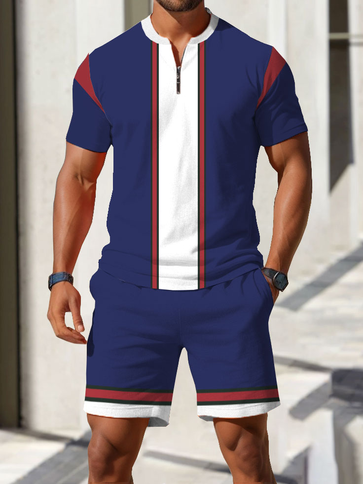 Men's fashion casual round-neck zipper geometric printed short-sleeved two-piece set 2504000042