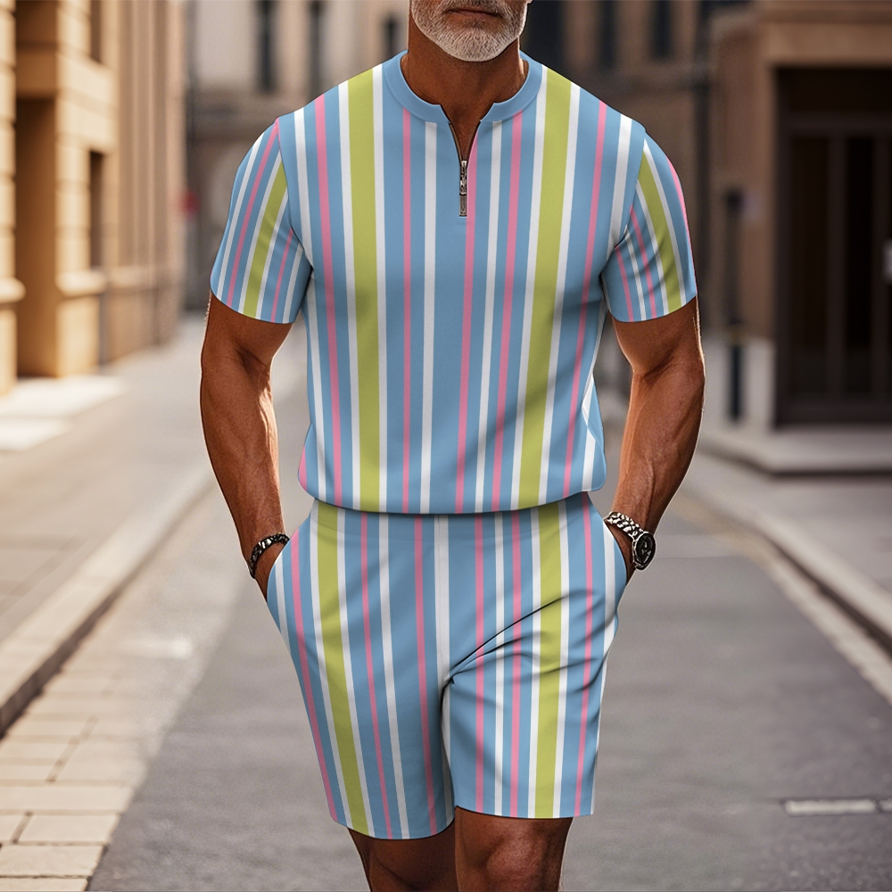 Men's fashion casual round-neck zipper geometric printed short-sleeved two-piece set 2504000075