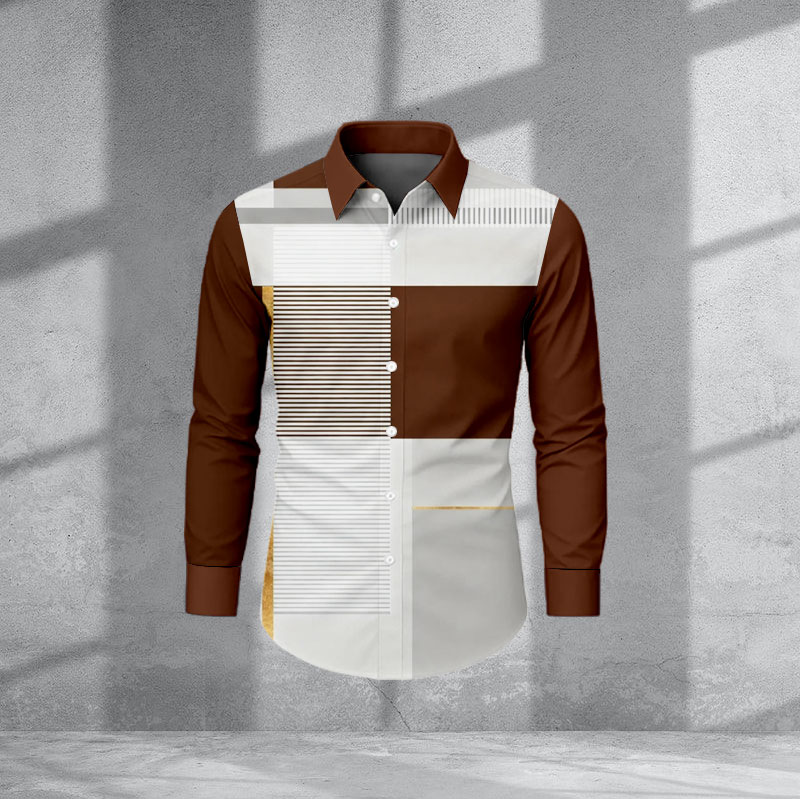 Men's Casual Business Brown & Gray Color Matching Geometric Printed Long Sleeve Lapel Shirts