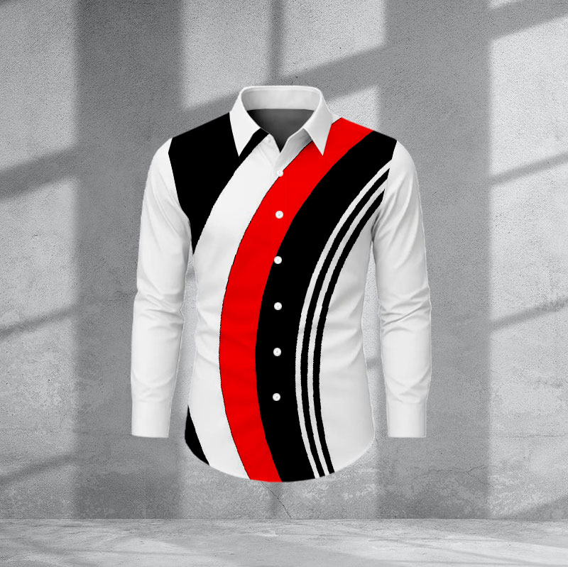 Men's Casual And Business Red Black & White Color Matching Striped Printed Long Sleeve Lapel Shirts
