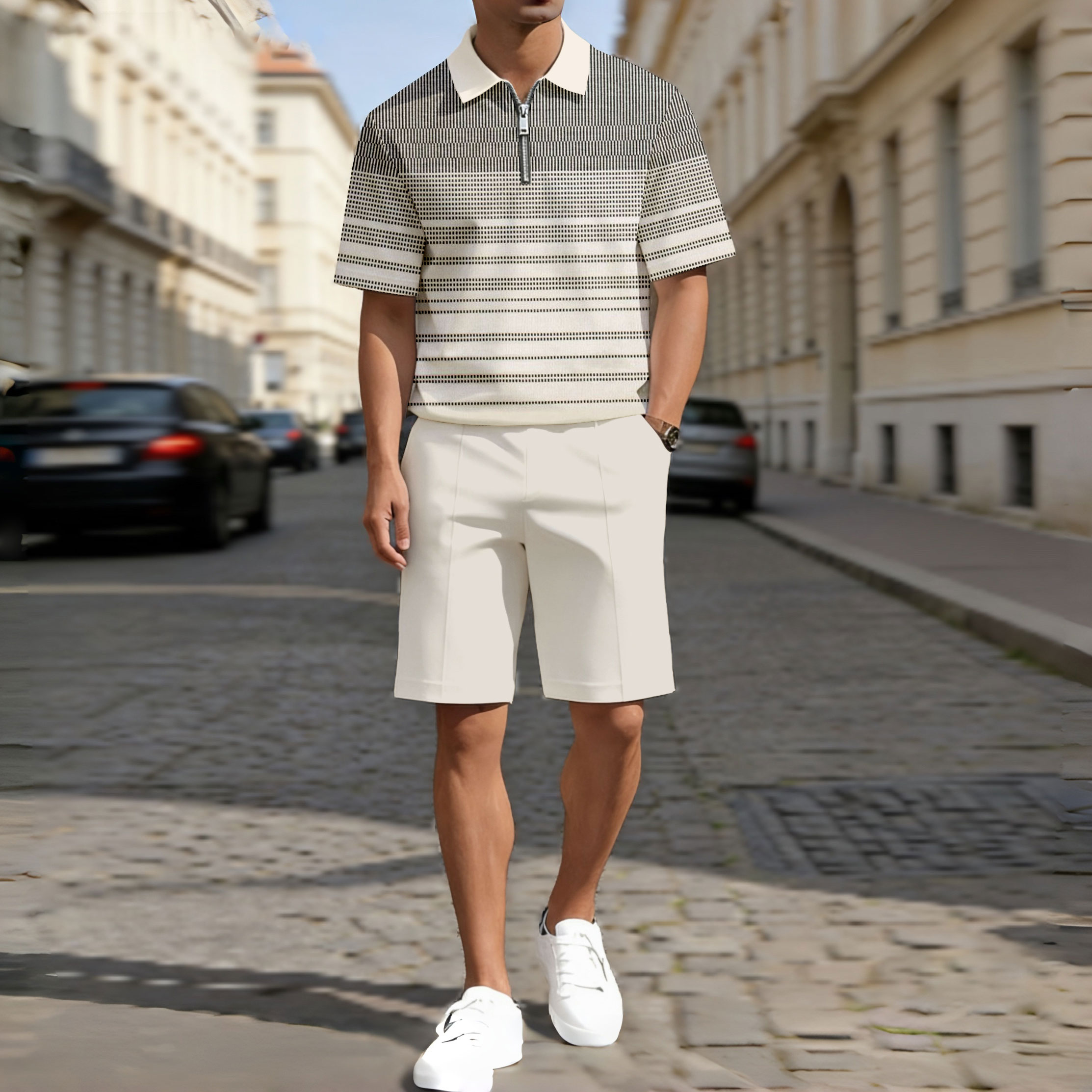 Men's Casual Apricot & Black Color Matching Gradient Striped Printed Zipper Short Sleeved Polo Shirt & Five-Point Pants Two-Piece Set