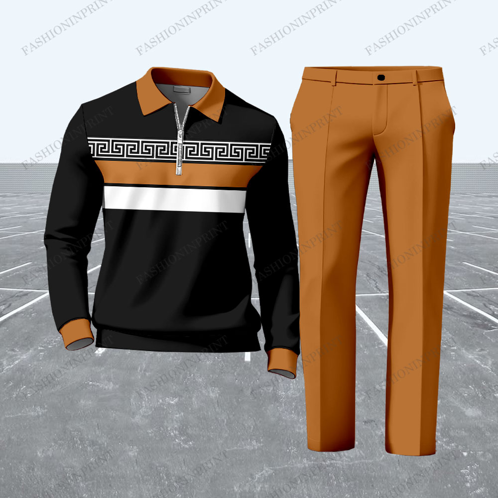 Men's Casual Black & Brown Color Matching Striped Printed Zipper Long Sleeved Polo Shirt & Trousers Two-Piece Set