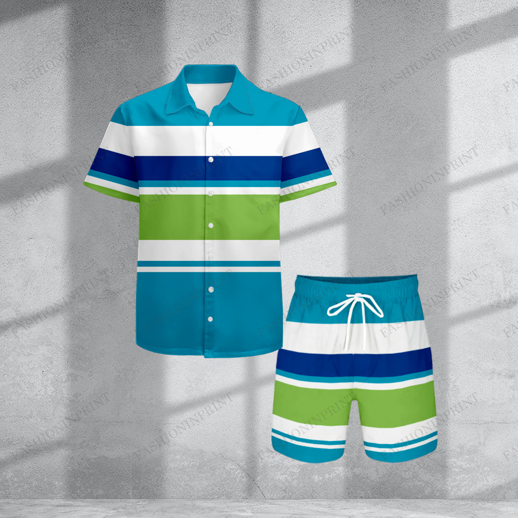 Men's Casual Blue Striped Print Short-Sleeved Shirt And Shorts Two-Piece Set
