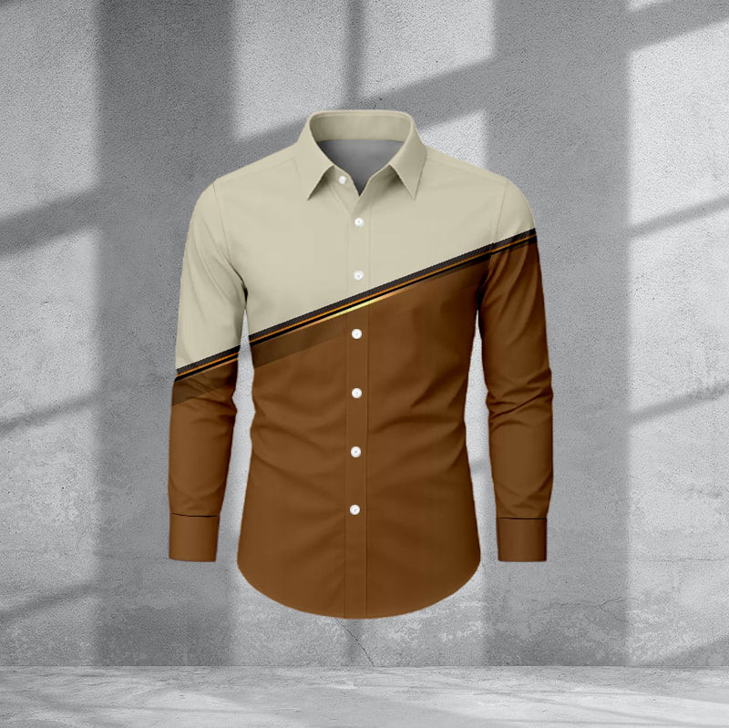 Men's Casual Brown & Beige Color Matching Print Long-Sleeve Shirt