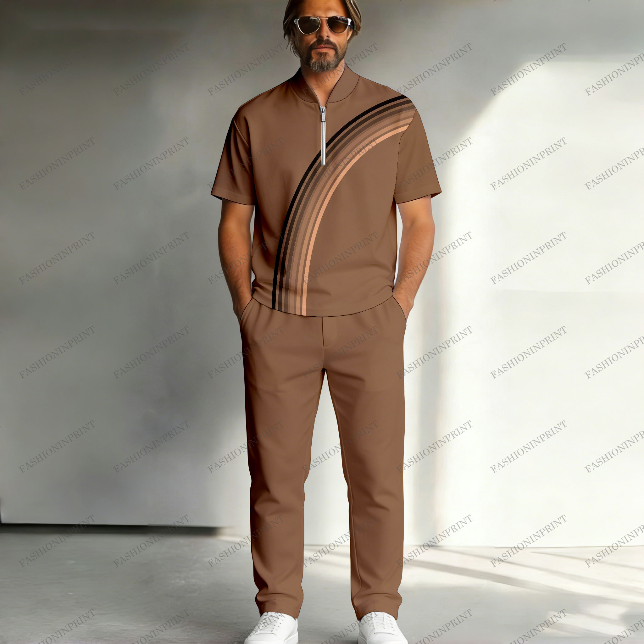 Men's Casual Brown Color Matching Printed Short Sleeved Zipper Polo Shirt & Trousers Two-Piece Set