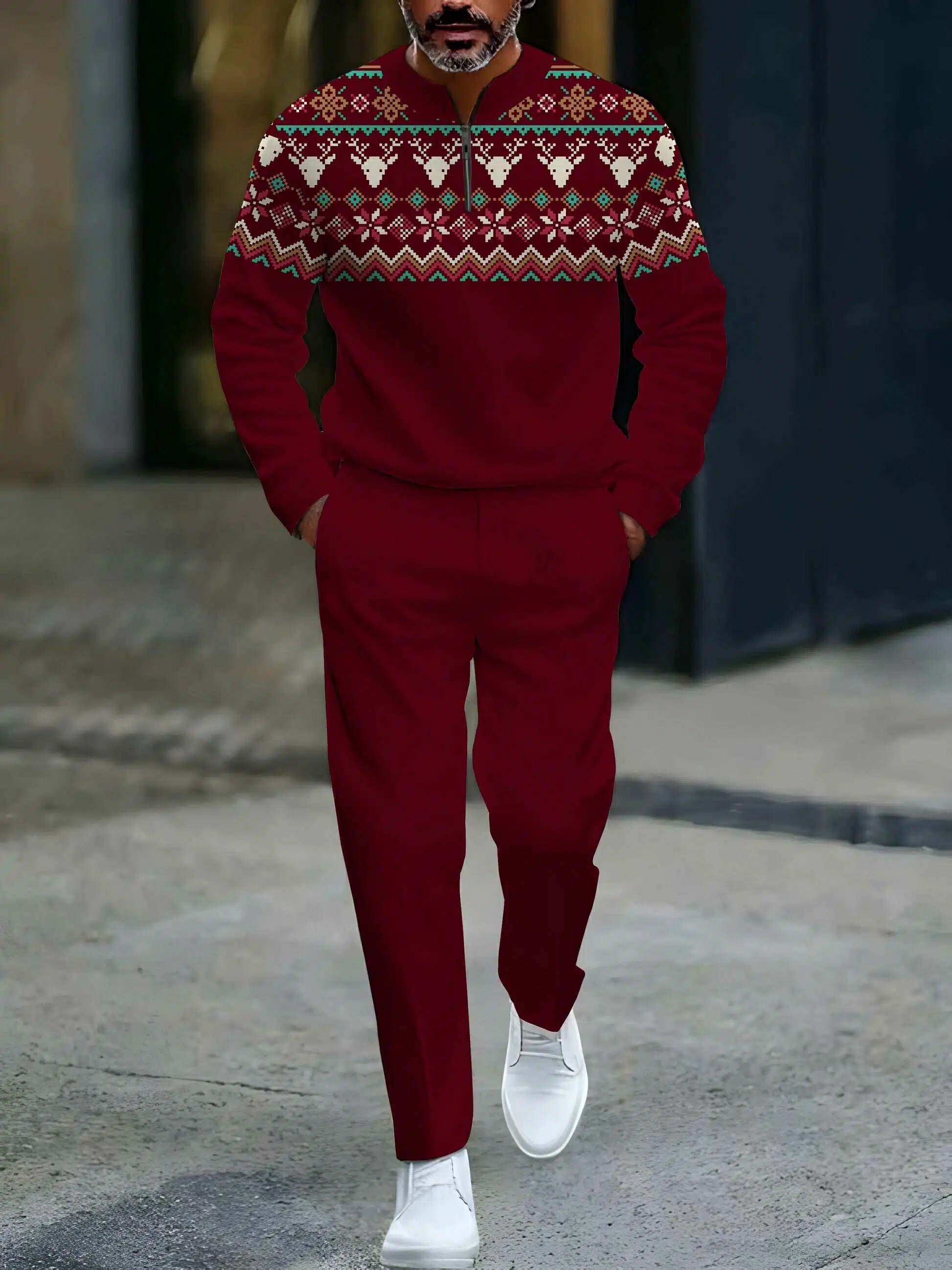Men's Casual Maroon Color Matching Christmas Printed Round-Neck Zipper Long Sleeved Sweatshirt & Trousers Two-Piece Set