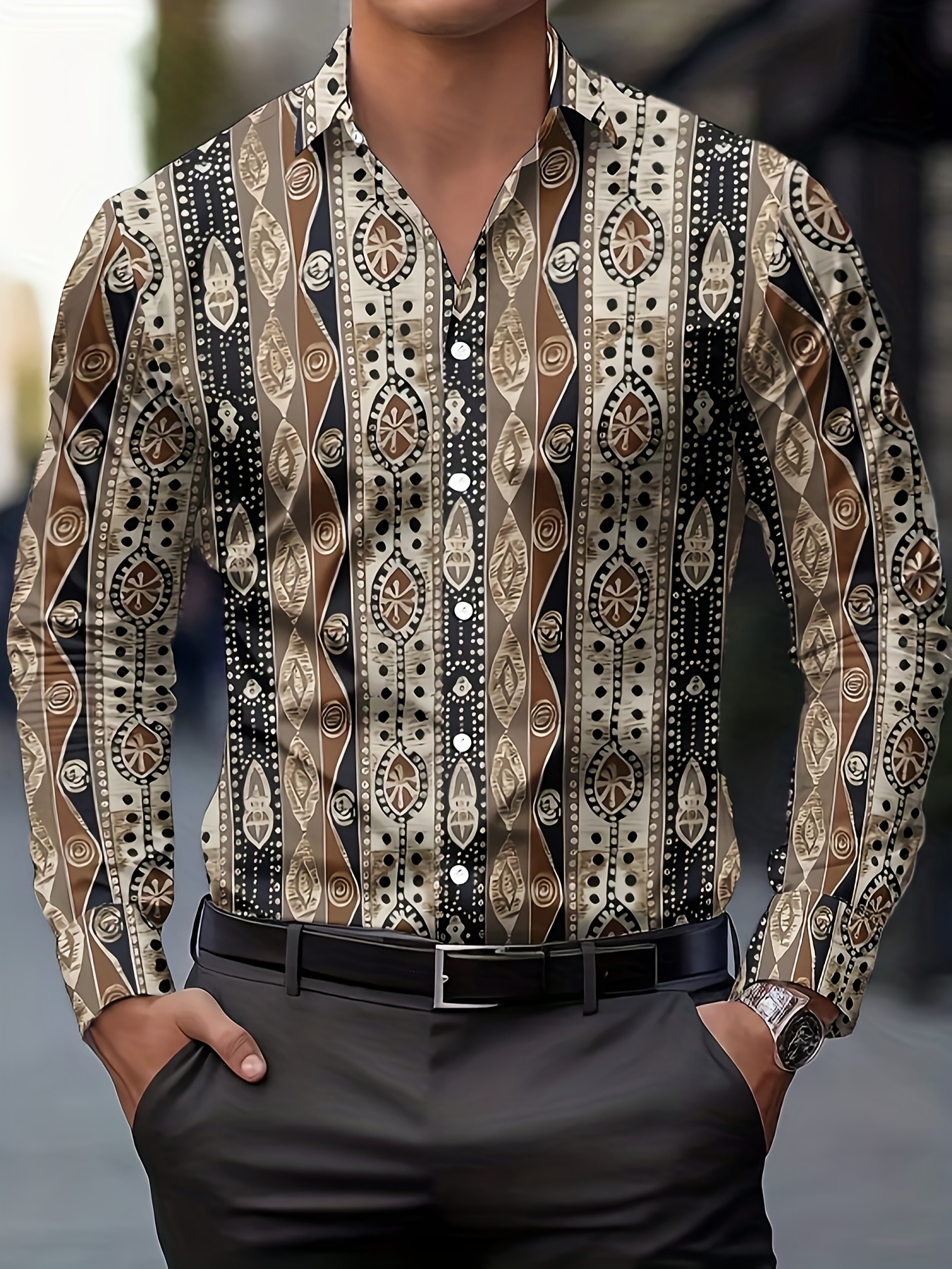 Men's Casual Coffee Color Matching Retro Style Print Long-Sleeve Shirt