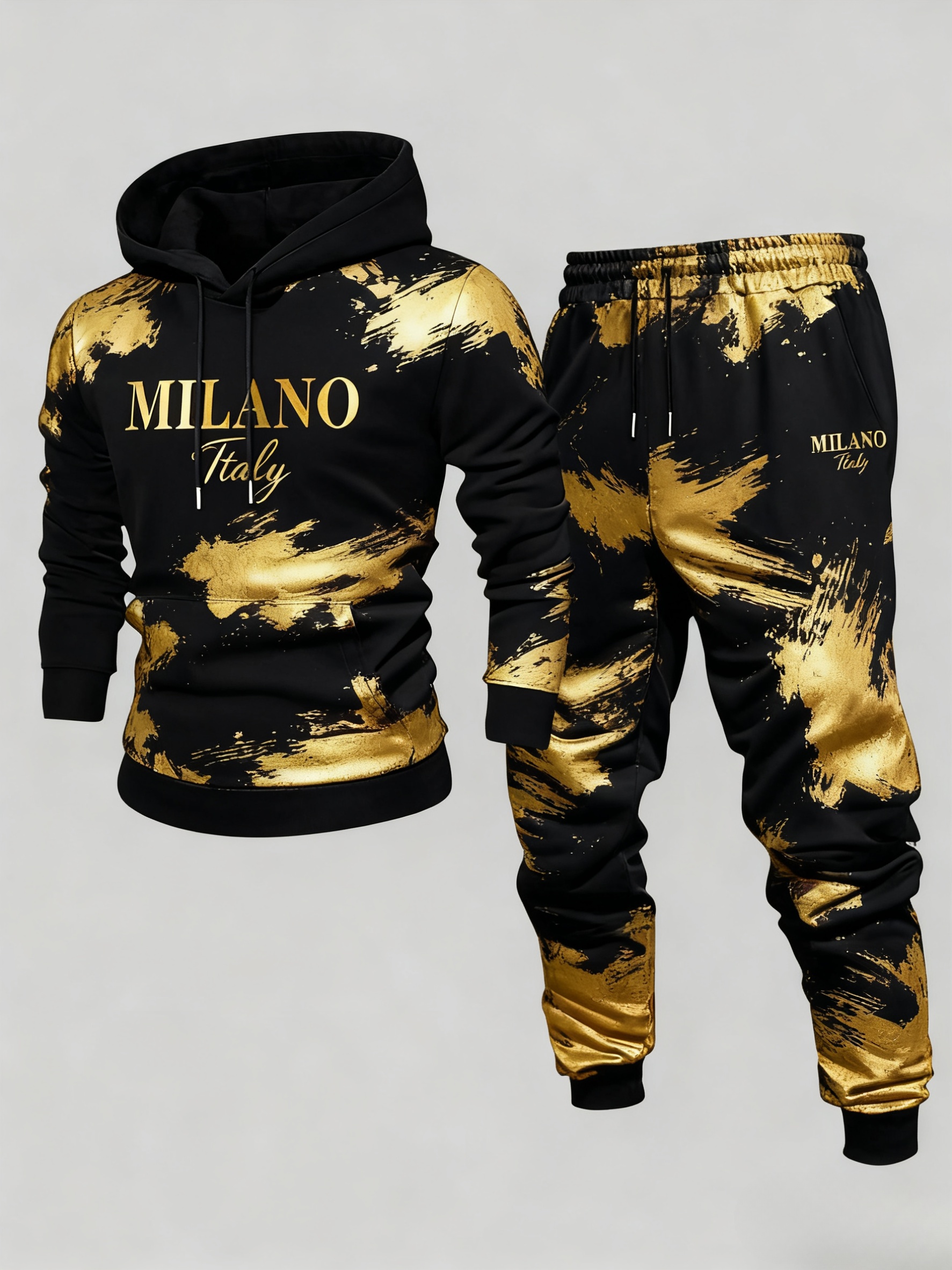 Men's Casual Black & Gold Color Matching Printed Hoodies Long Sleeved Sweatshirts & Sweatpants Two-Piece Set