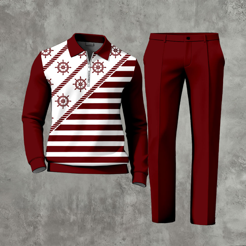 Men's Casual Color Matching Printed Polo-Collar Zipper Long Sleeved Trousers Two-Piece Set