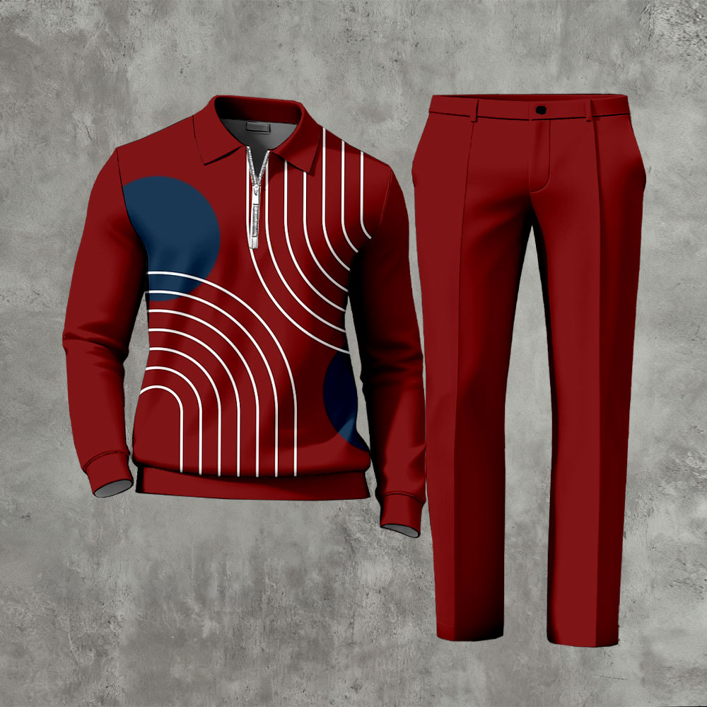 Men's Casual Color Matching Printed Polo-Collar Zipper Long Sleeved Trousers Two-Piece Set