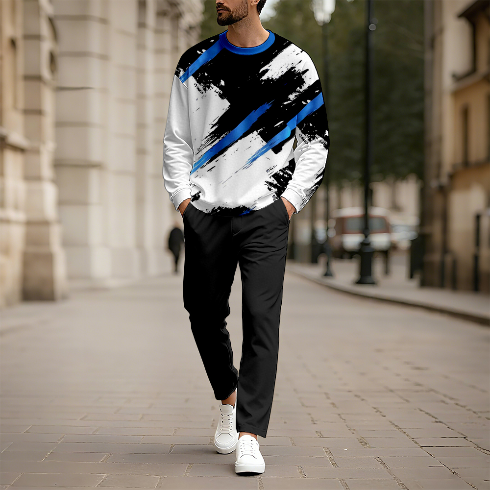Men's Casual Color Matching Printed Round-Neck Long Sleeved Trousers Two-Piece Set