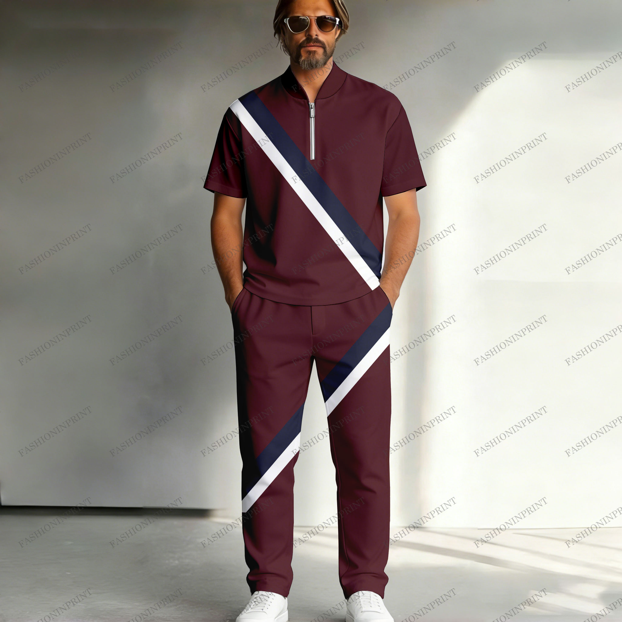 Men's Casual Maroon Color Matching Striped Printed Short Sleeved Zipper Polo Shirt & Trousers Two-Piece Set