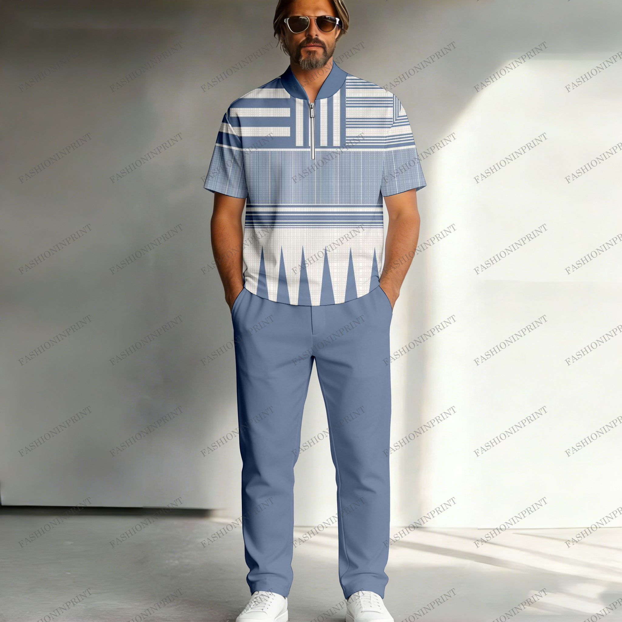 Men's Casual Blue & White Color Matching Geometric Printed Short Sleeved Zipper Polo Shirt & Trousers Two-Piece Set