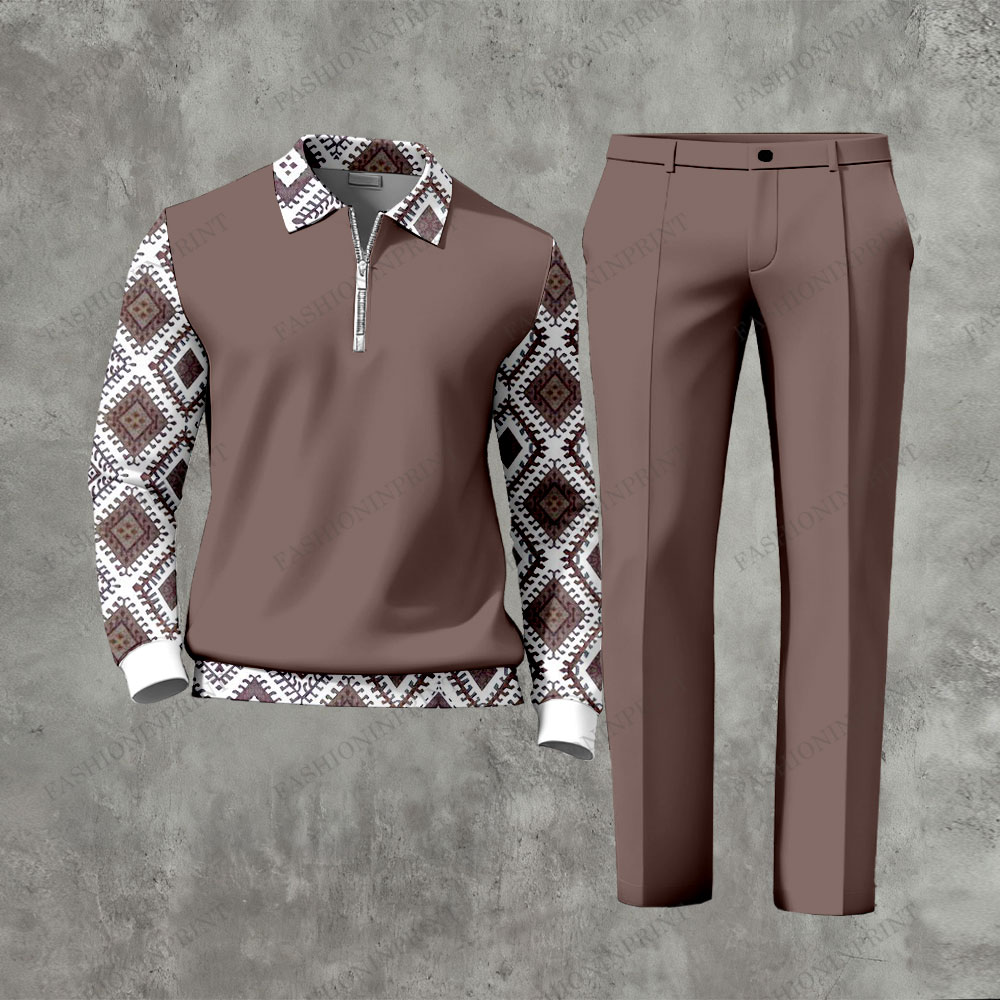 Men's Casual Red Brown & White Color Matching Retro Style Printed Zipper Long Sleeved Polo Shirt & Trousers Two-Piece Set