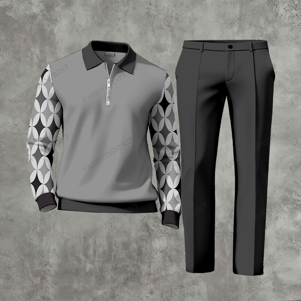 Men's Casual Dark Gray & Gray Color Matching Retro Style Printed Zipper Long Sleeved Polo Shirt & Trousers Two-Piece Set