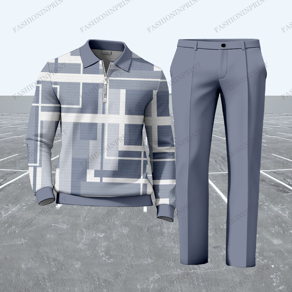 Men's Casual Gray Blue Color Matching Geometric Printed Zipper Long Sleeved Polo Shirt & Trousers Two-Piece Set