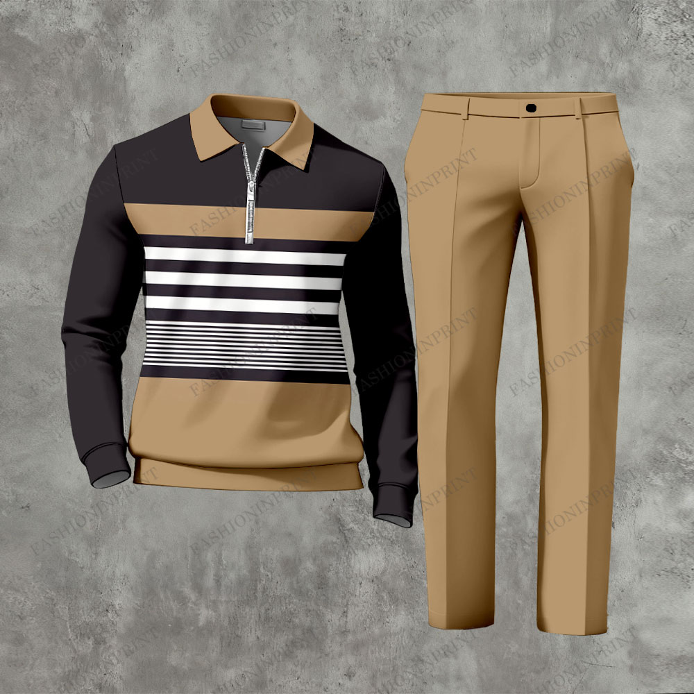 Men's Casual Tan & Dark Coffee Color Matching Striped Printed Zipper Long Sleeved Polo Shirt & Trousers Two-Piece Set