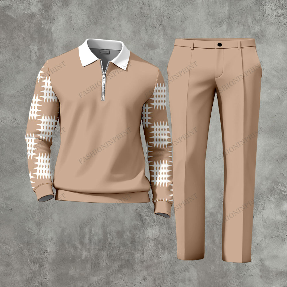 Men's Casual Apricot & White Color Matching Geometric Printed Zipper Long Sleeved Polo Shirt & Trousers Two-Piece Set
