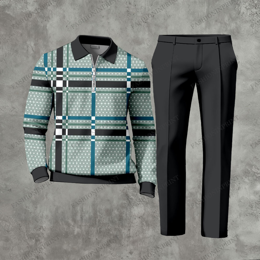 Men's Casual Green & Black Color Matching Geometric Printed Zipper Long Sleeved Polo Shirt & Trousers Two-Piece Set