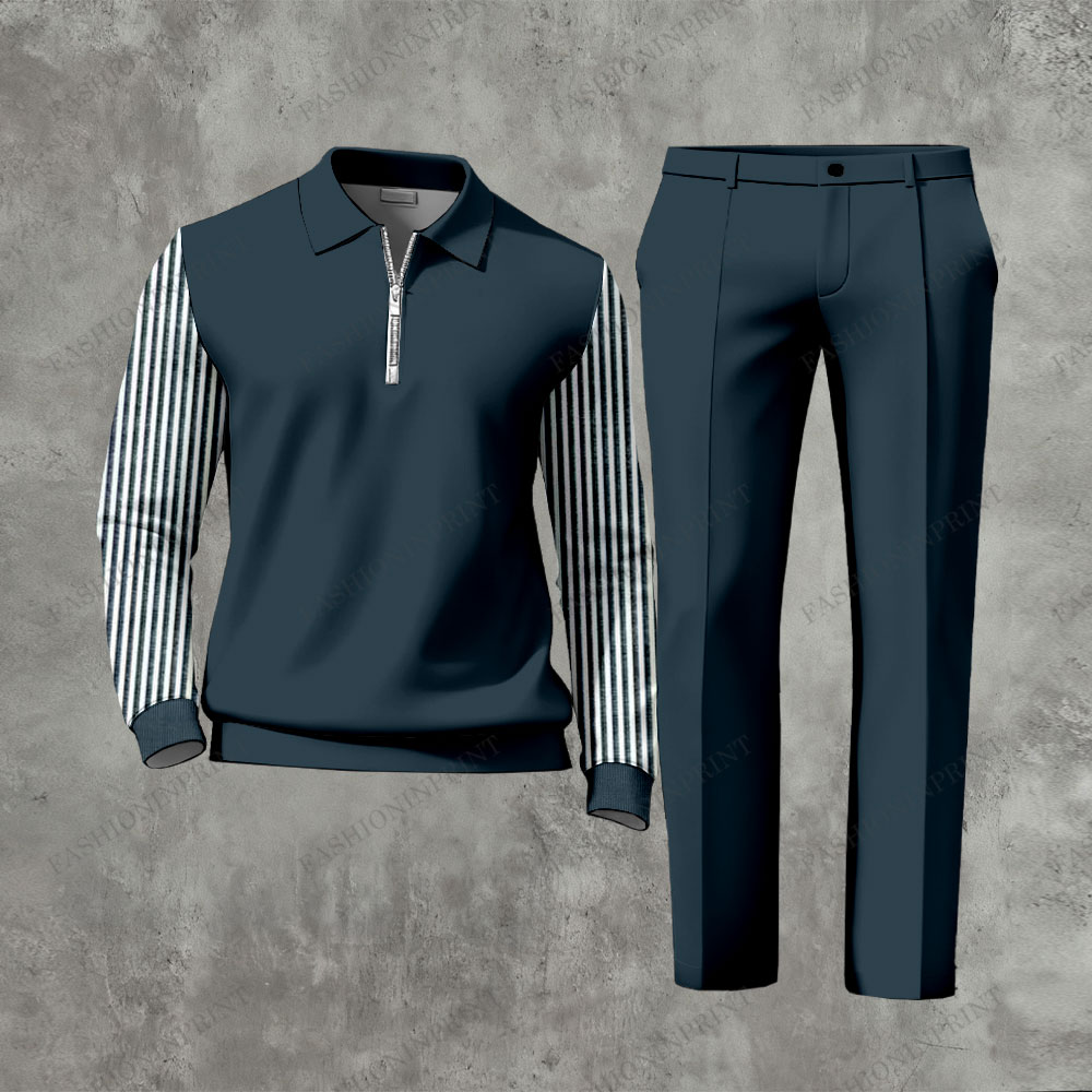 Men's Casual Dark Blue & White Color Matching Striped Printed Zipper Long Sleeved Polo Shirt & Trousers Two-Piece Set