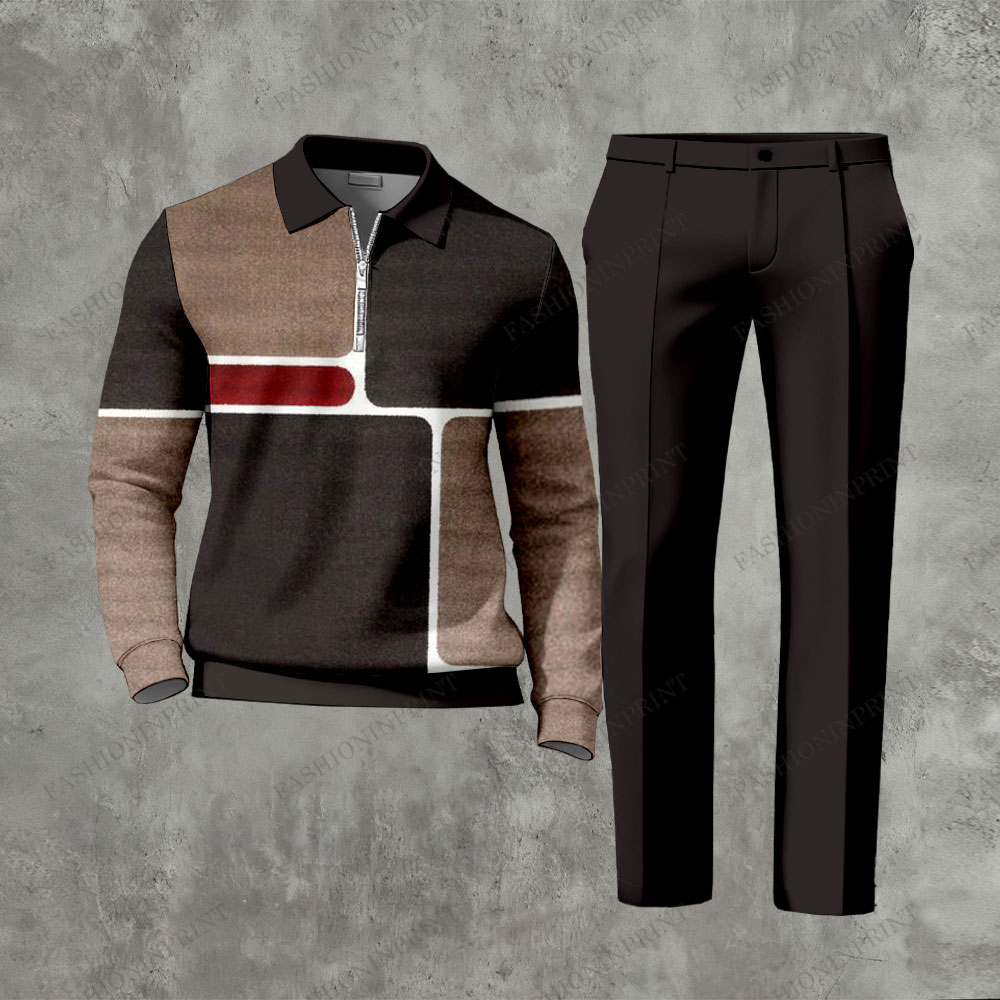 Men's Casual Dark Coffee & Khaki Color Matching Geometric Printed Zipper Long Sleeved Polo Shirt & Trousers Two-Piece Set