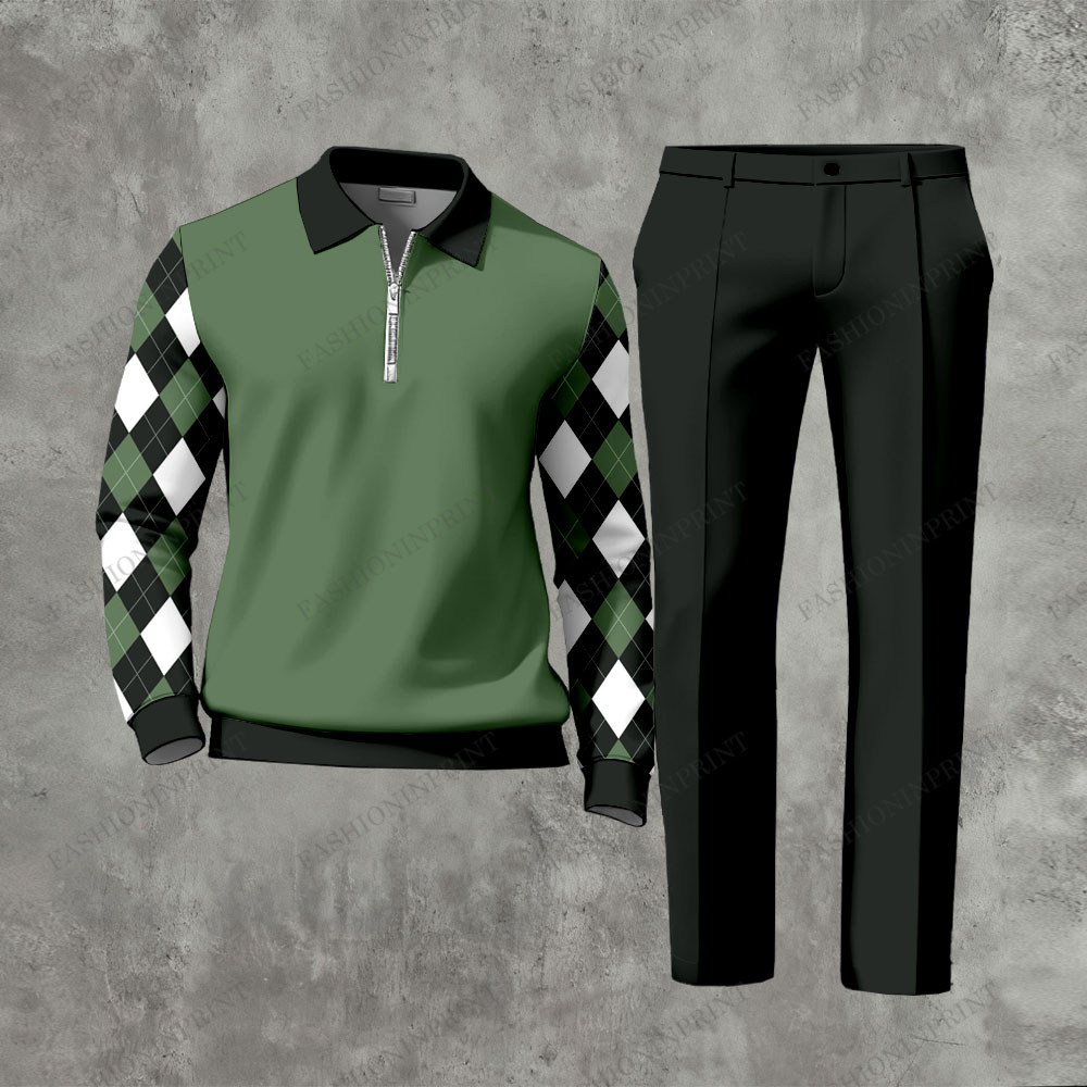 Men's Casual Dark Green & Green Color Matching Checkered Printed Zipper Long Sleeved Polo Shirt & Trousers Two-Piece Set