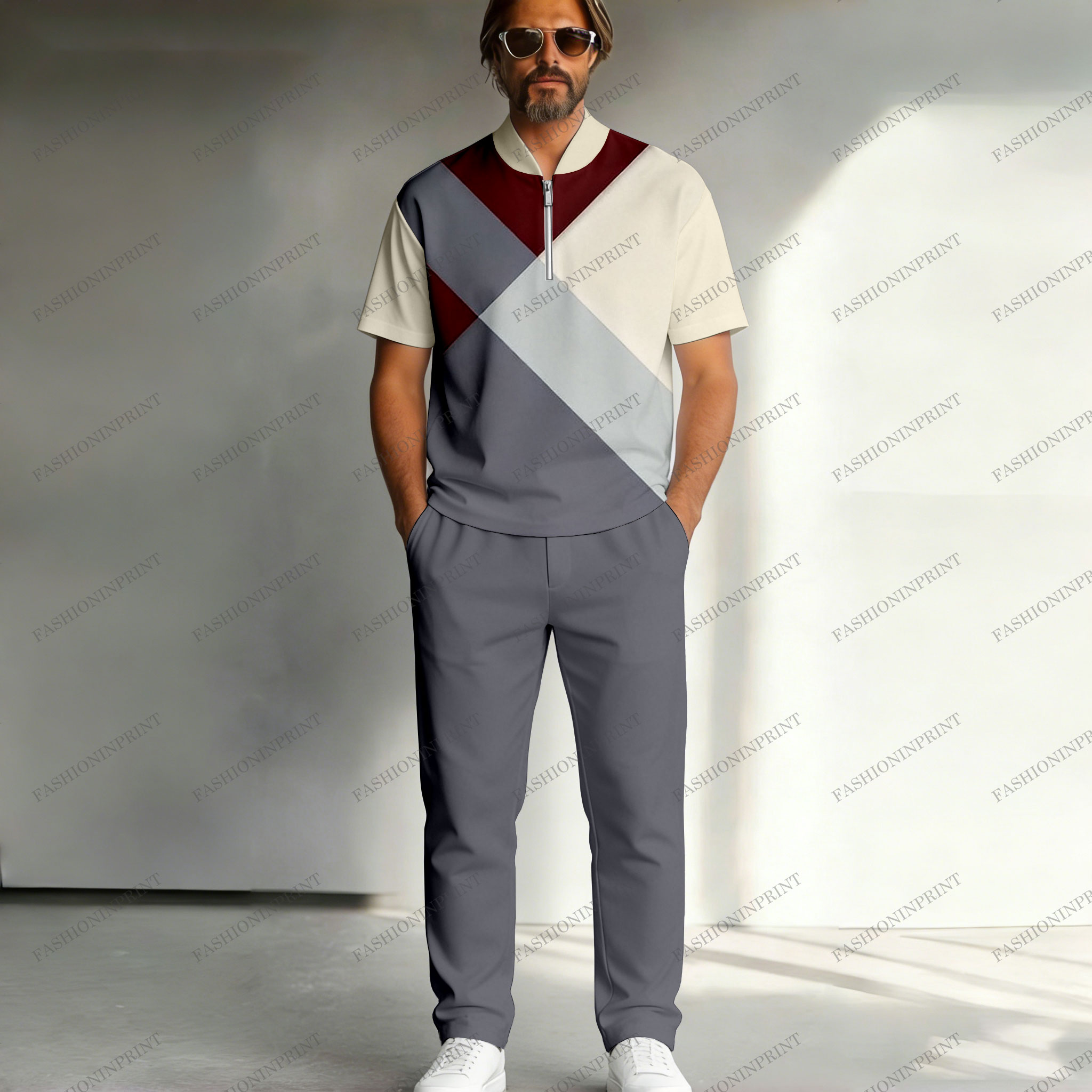 Men's Casual Gray & Apricot Color Matching Geometric Printed Short Sleeved Zipper Polo Shirt & Trousers Two-Piece Set