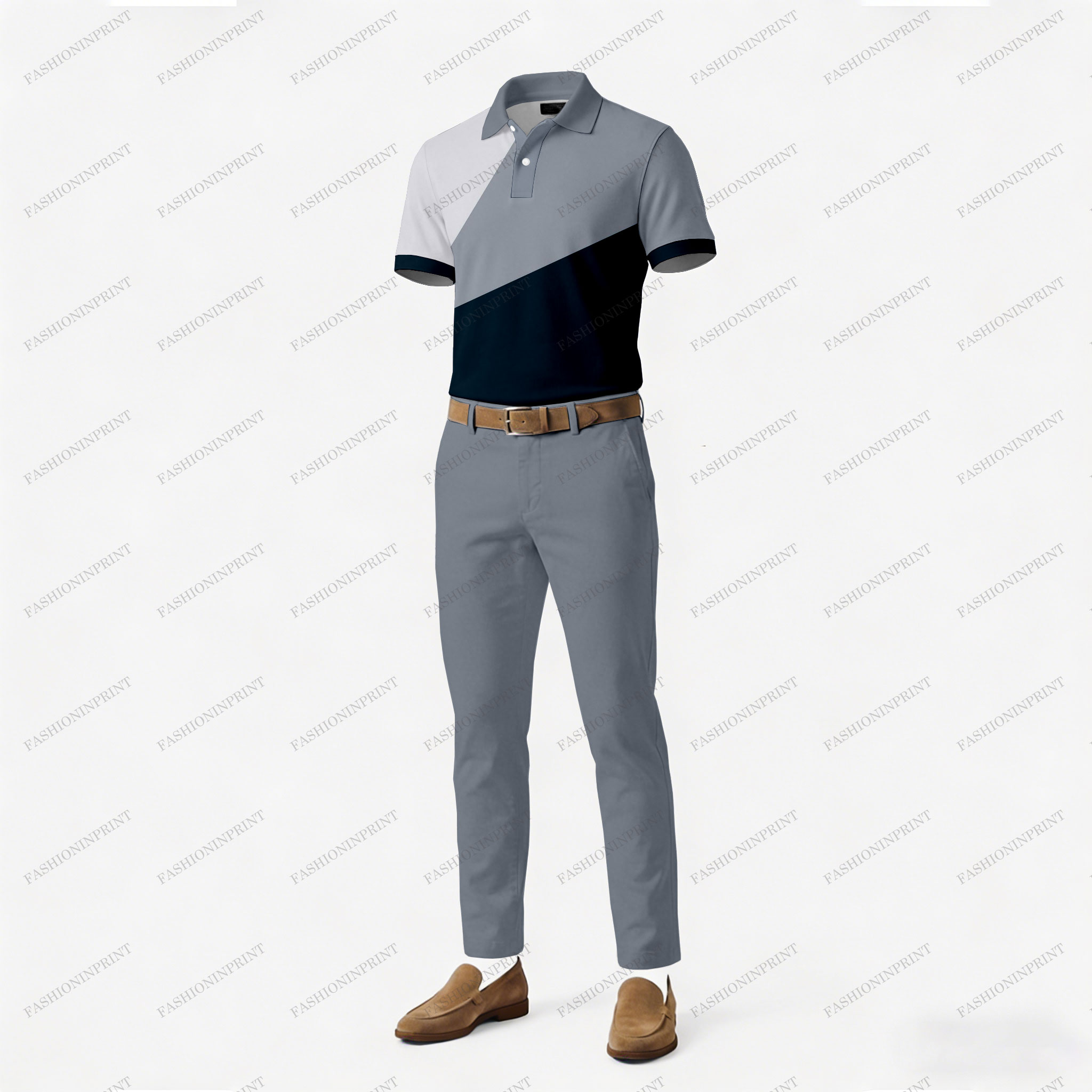 Men's Casual Gray & Black Color Matching Printed Short Sleeved Polo Shirt & Trousers Two-Piece Set