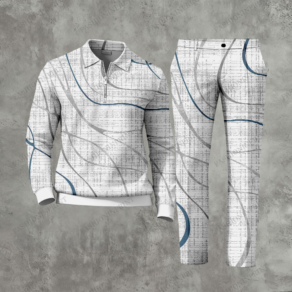 Men's Casual Gray & Black Color Matching Printed Zipper Long Sleeved Polo Shirt & Trousers Two-Piece Set