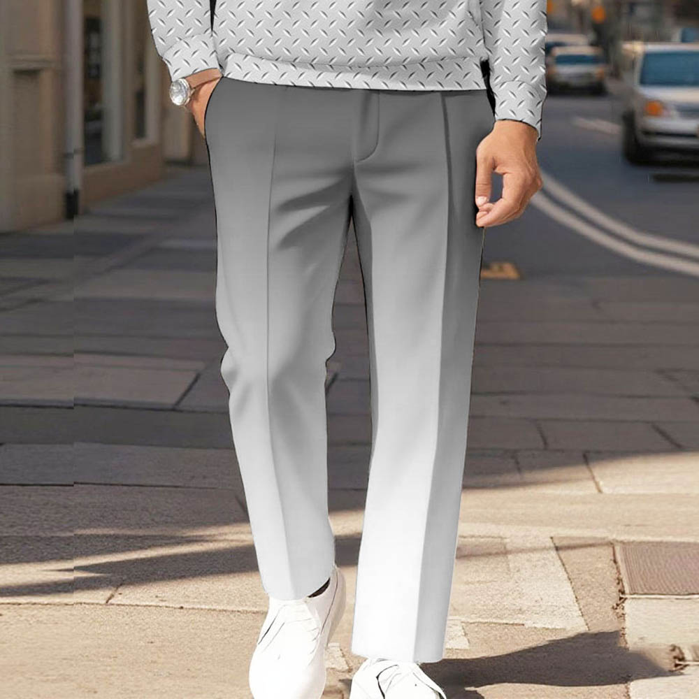 Men's Casual Gray Color Matching Gradient Printed Polo-Collar Zipper Long Sleeved Trousers Two-Piece Set